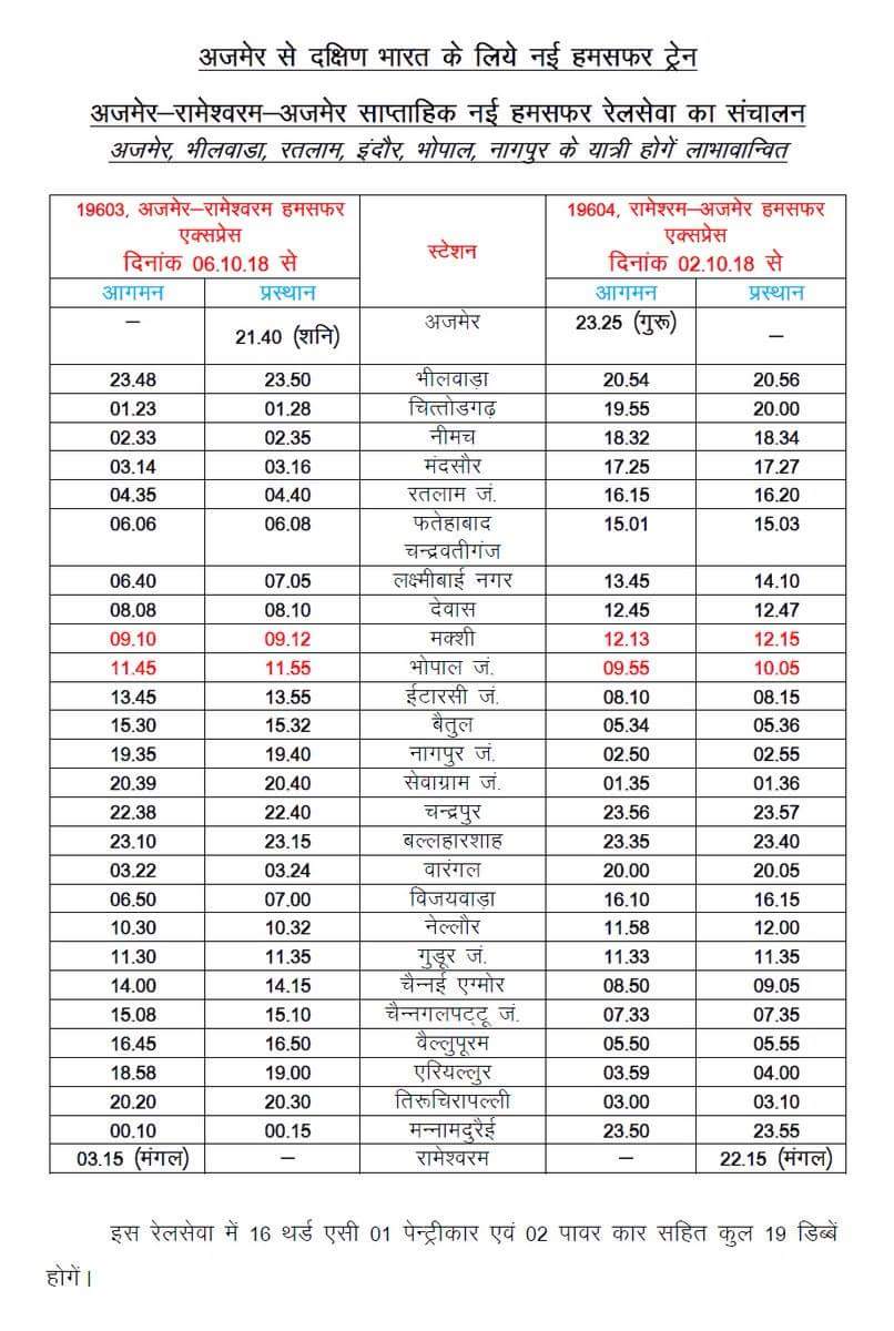 UncategorisedAjmer Rameshwaram New Humsafar train time table 3rd Oct 20183rd Oct 2018 Rail Duniya Share this: Click to share on WhatsApp (Opens in new window) WhatsApp Click to share on X (Opens in new window) X Click to share on Facebook (Opens in new window) Facebook Click to share on Telegram (Opens in new window) Telegram Click to email a link to a friend (Opens in new window) Email Like Loading... Related Published by Rail Duniya Rail Duniya is a magazine publishing all India train timings since 1988. View all posts by Rail Duniya