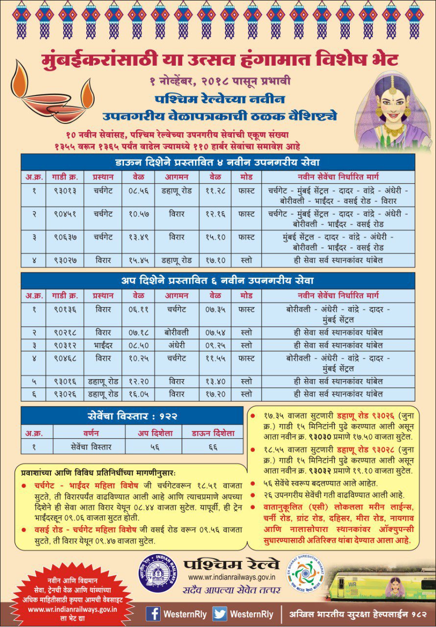 UncategorisedNew TT for WR Mumbai suburban. 1st Nov 2018 Rail Duniya Share this: Share on WhatsApp (Opens in new window) WhatsApp Share on X (Opens in new window) X Share on Facebook (Opens in new window) Facebook Share on Telegram (Opens in new window) Telegram Email a link to a friend (Opens in new window) Email Like Loading... Related Published by Rail Duniya Rail Duniya is a magazine publishing all India train timings since 1988. View all posts by Rail Duniya