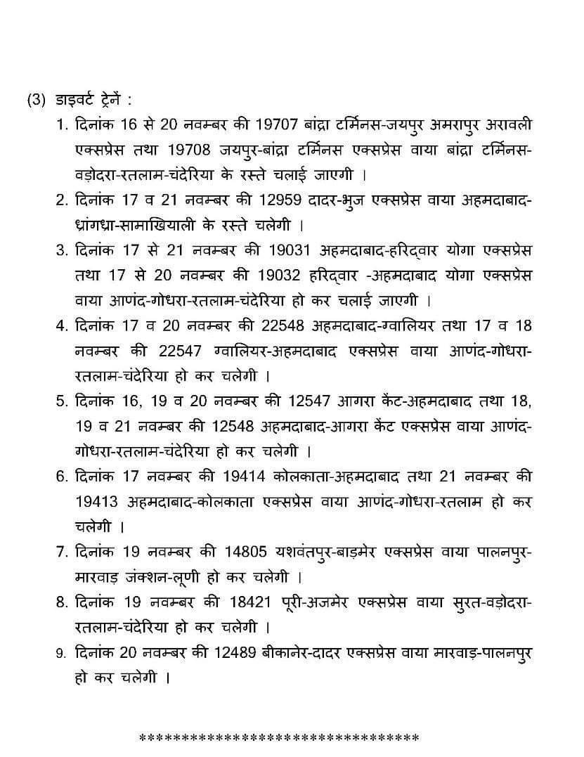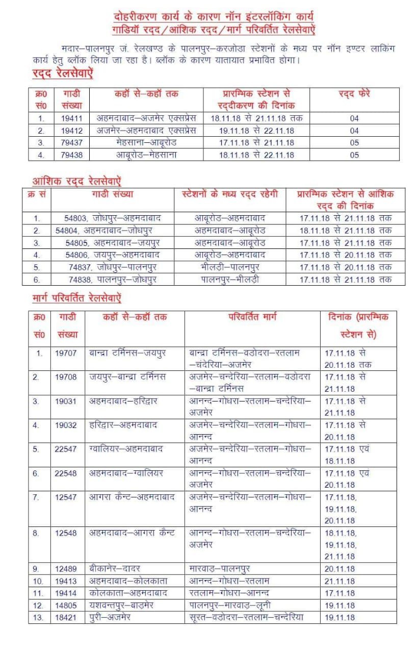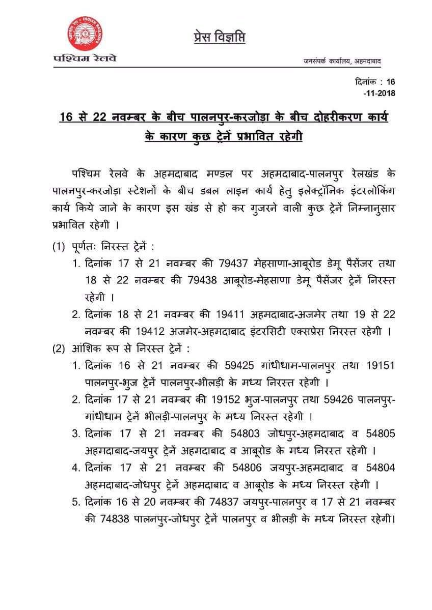 पश्चिम रेल्वे के अहमदाबाद पालनपुर खंड पर रेल का, दोहरीकरण का कार्य चल रहा है। कुछ गाड़िया रदद् रहेंगी, कुछ गाड़िया आंशिक रदद् रहेगी तो कुछ अलग रास्तेसे चलेगी। कृपया अधिकृत विज्ञप्ति पोस्ट कर रहे है।