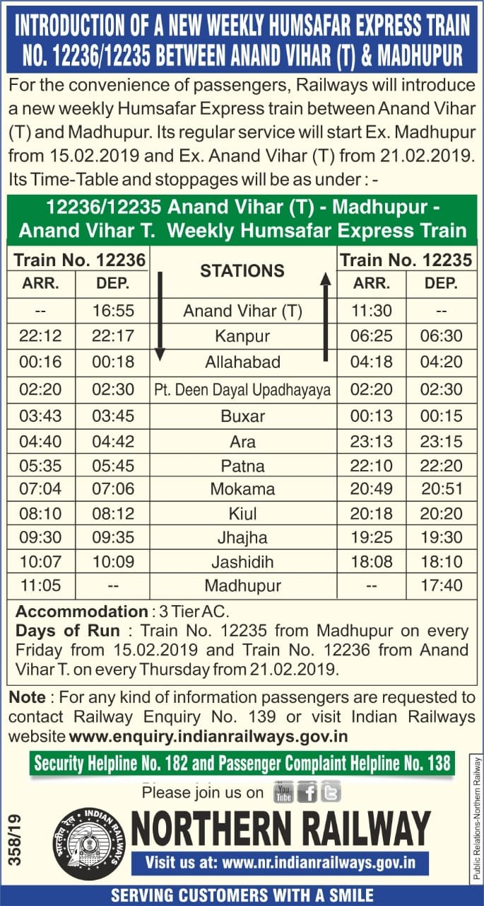 UncategorisedOne more Humsafar.. 7th Feb 2019 Rail Duniya New train, Humsafar Express between Anand Vihar Terminus and Madhupur with effect from 15th Feb. Share this: Share on WhatsApp (Opens in new window) WhatsApp Share on X (Opens in new window) X Share on Facebook (Opens in new window) Facebook Share on Telegram (Opens in new window) Telegram Email a link to a friend (Opens in new window) Email Like Loading... Related Published by Rail Duniya Rail Duniya is a magazine publishing all India train timings since 1988. View all posts by Rail Duniya