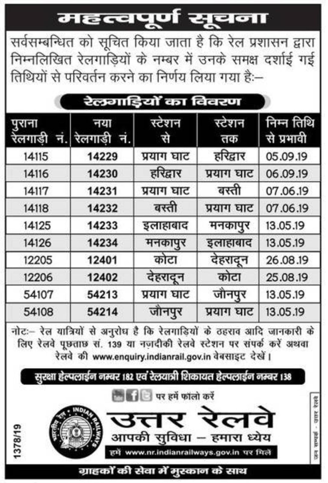 Uncategorisedउत्तर रेलवे में गाड़ियोंके नम्बर बदल रहे है। 11th May 2019 Rail Duniya Share this: Share on WhatsApp (Opens in new window) WhatsApp Share on X (Opens in new window) X Share on Facebook (Opens in new window) Facebook Share on Telegram (Opens in new window) Telegram Email a link to a friend (Opens in new window) Email Like Loading... Related Published by Rail Duniya Rail Duniya is a magazine publishing all India train timings since 1988. View all posts by Rail Duniya