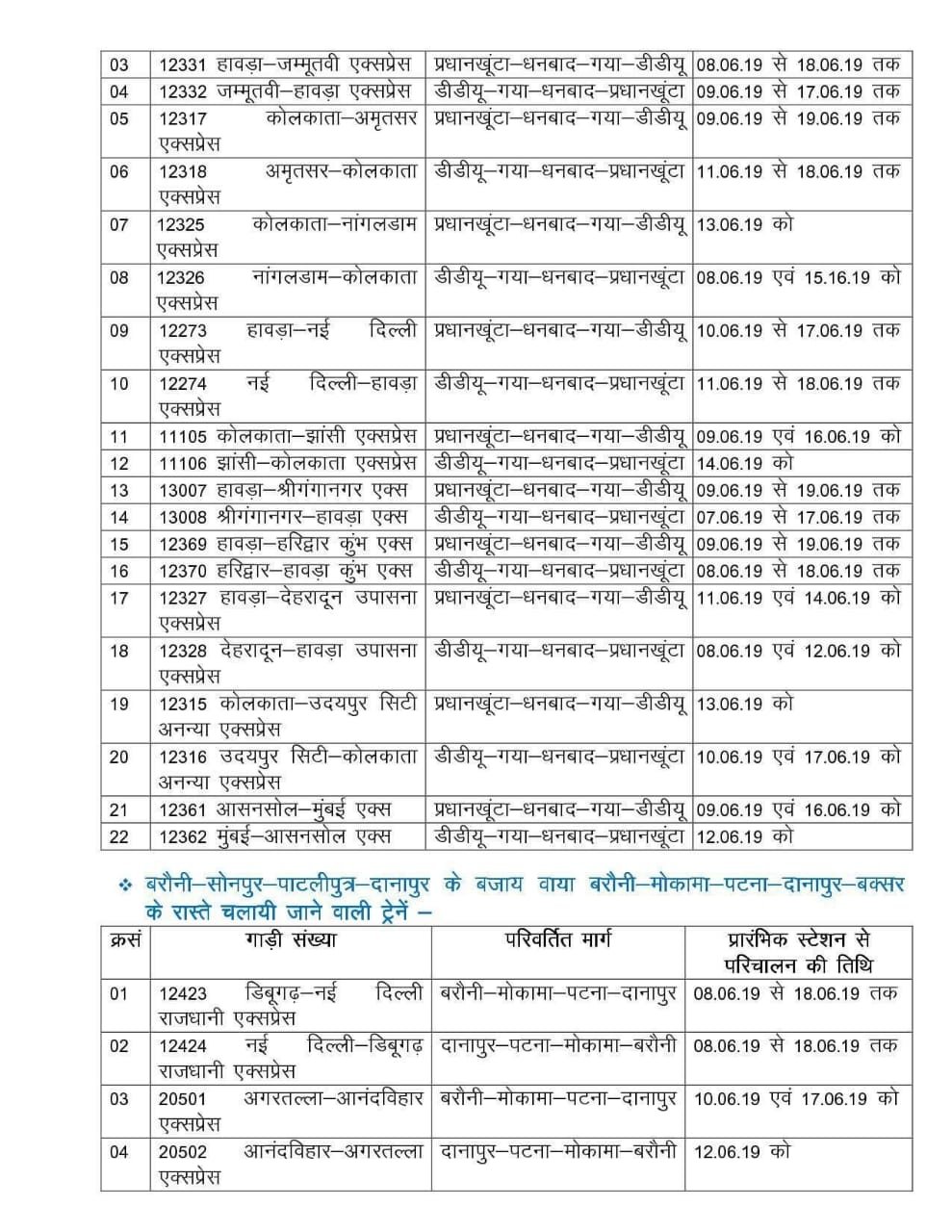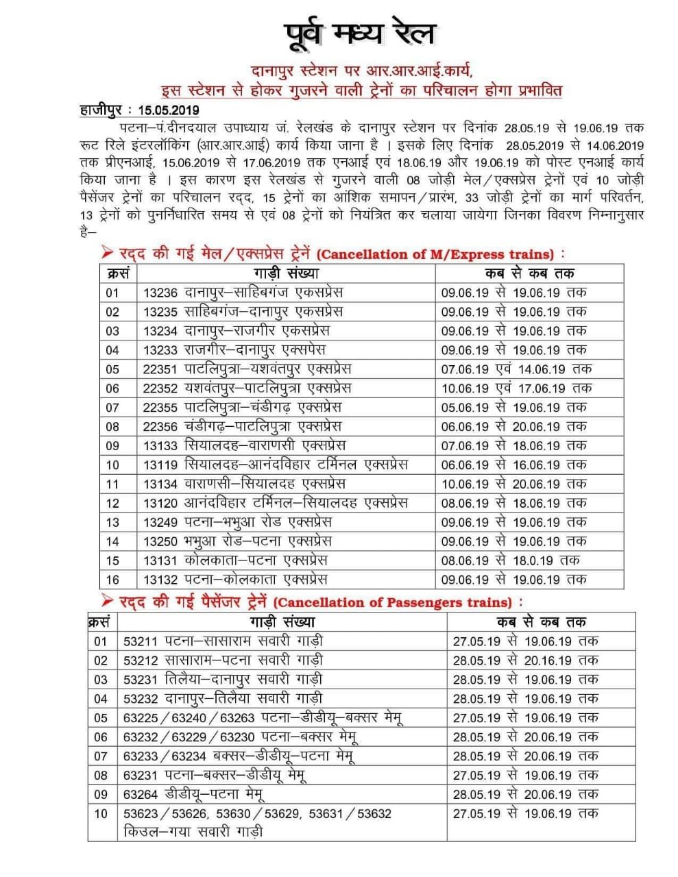 बिहार की राजधानी पटना के पास, दानापुर स्टेशन में रेलवे के, रूट रिले इंटरलाकिंग का कार्य शुरू होने जा रहा है। इस कार्य हेतु पूर्व मध्य रेलवे से चलने वाली गाड़ियोंके परिचालन में अस्थायी फेरबदल होने जा रहा है।
