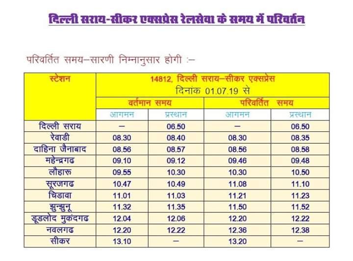 Uncategorisedउत्तर रेलवे: दिल्ली रेवाड़ी पैसेंजर का हिसार तक विस्तार एवं 14812 दिल्ली सीकर एक्सप्रेस का समय परिवर्तन 24th Jun 2019 Rail Duniya Share this: Share on WhatsApp (Opens in new window) WhatsApp Share on X (Opens in new window) X Share on Facebook (Opens in new window) Facebook Share on Telegram (Opens in new window) Telegram Email a link to a friend (Opens in new window) Email Like Loading... Related Published by Rail Duniya Rail Duniya is a magazine publishing all India train timings since 1988. View all posts by Rail Duniya