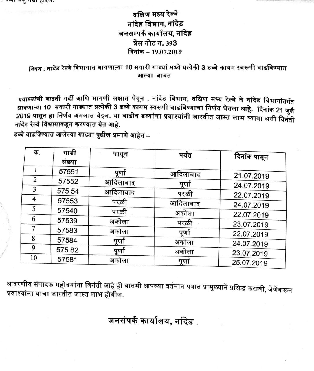 Uncategorisedदक्षिण मध्य रेलवे, नान्देड विभाग का यात्री सेवा मे सराहनीय कदम 19th Jul 2019 Rail Duniya नान्देड विभाग में चलनेवाली सभी सवारी गाड़ियोंमे 3-3 द्वितीय श्रेणी यात्री डिब्बे बढ़ाए जा रहे है। Share this: Share on WhatsApp (Opens in new window) WhatsApp Share on X (Opens in new window) X Share on Facebook (Opens in new window) Facebook Share on Telegram (Opens in new window) Telegram Email a link to a friend (Opens in new window) Email Like Loading... Related Published by Rail Duniya Rail Duniya is a magazine publishing all India train timings since 1988. View all posts by Rail Duniya