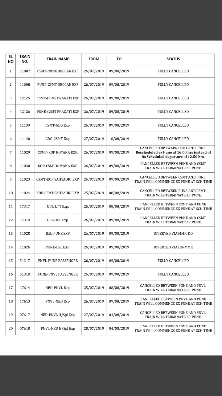रेल प्रबंधक, पुणे से एक परिपत्रक प्रसारीत किया गया है। जिसमे रद्द की गई गाड़ियोंकी लिस्ट है और साथही कई गाड़ियोंके चलन क्षेत्र भी कम किए गए है। कुछ गाड़ियोंके समय परिवर्तन भी है।