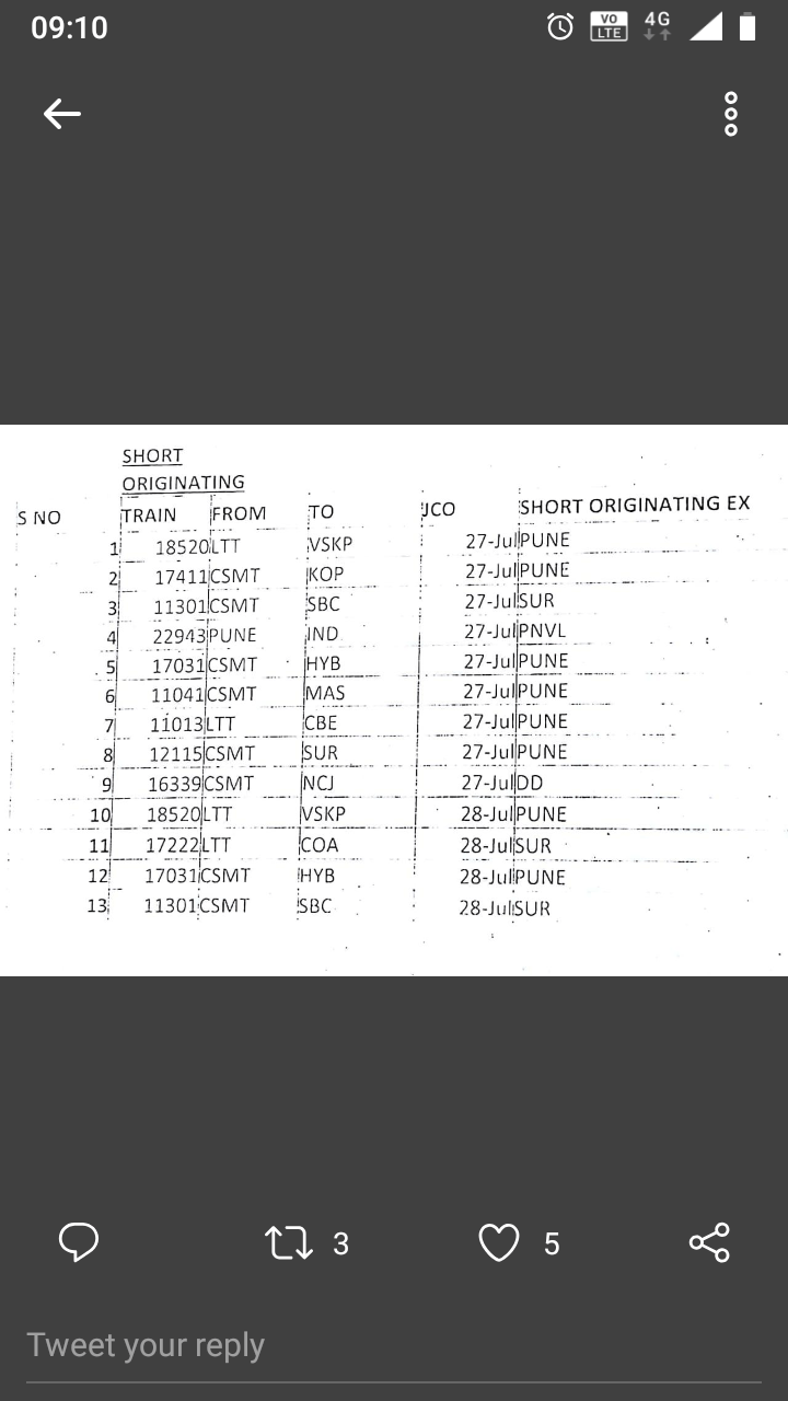 दिनांक 28 जुलाई को शार्ट ओरिजनेटिंग याने निर्धारित स्टेशनोंसे छूटने की बजाय बीच के स्टेशन से रवाना की जाने वाली गाड़ियाँ।