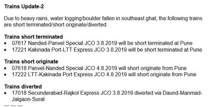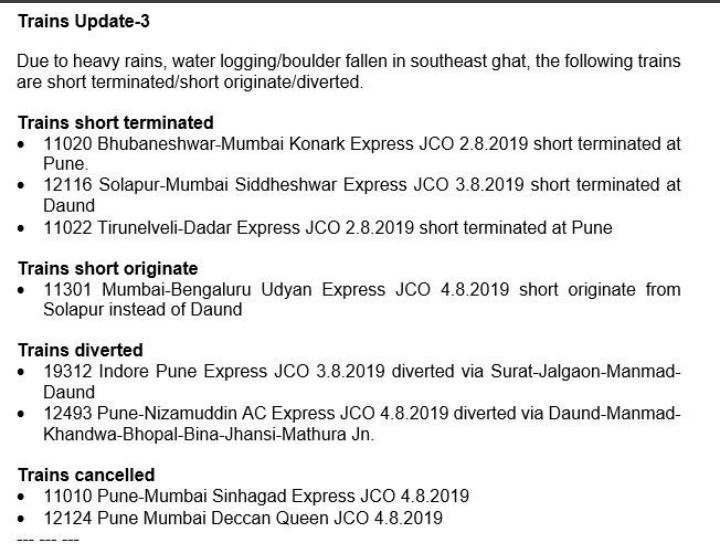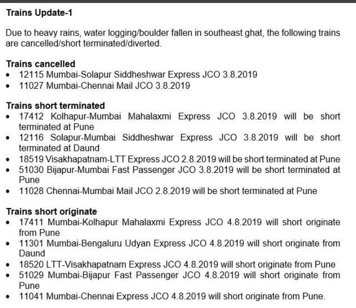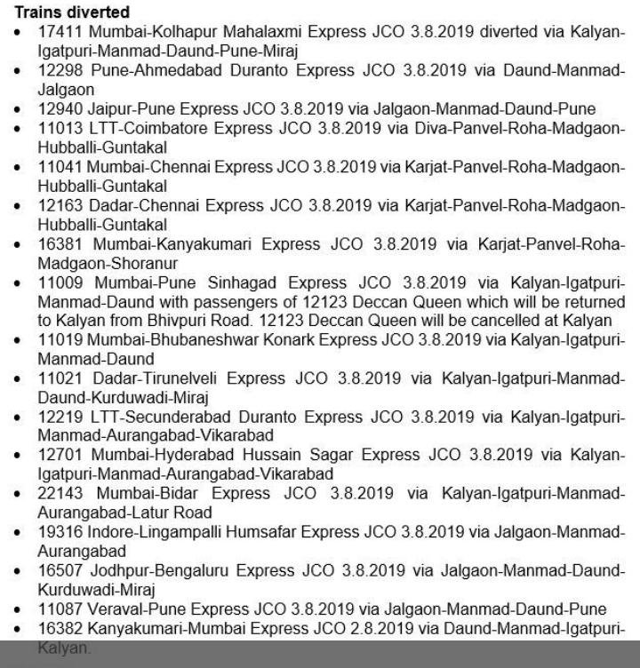 Central railway circular about trains to and from Mumbai CSMT. Some trains has been cancelled, diverted, short terminated.