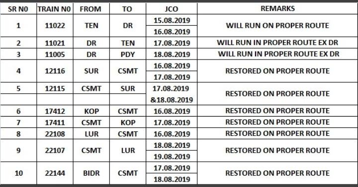 UncategorisedUpdates on central railway 16th Aug 201916th Aug 2019 Rail Duniya Dt 16th August, time : 21.30 Most of the trains on Pune Solapur route now restored. Please check. Share this: Click to share on WhatsApp (Opens in new window) WhatsApp Click to share on X (Opens in new window) X Click to share on Facebook (Opens in new window) Facebook Click to share on Telegram (Opens in new window) Telegram Click to email a link to a friend (Opens in new window) Email Like Loading... Related Published by Rail Duniya Rail Duniya is a magazine publishing all India train timings since 1988. View all posts by Rail Duniya