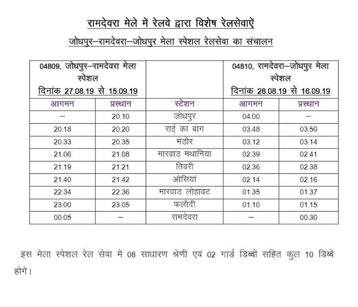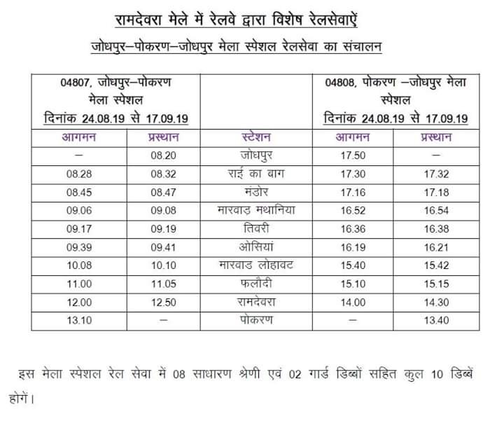 Uncategorisedरामदेवरा मेले के लिए जोधपुर से विशेष गाड़ियाँ 21st Aug 2019 Rail Duniya Share this: Share on WhatsApp (Opens in new window) WhatsApp Share on X (Opens in new window) X Share on Facebook (Opens in new window) Facebook Share on Telegram (Opens in new window) Telegram Email a link to a friend (Opens in new window) Email Like Loading... Related Published by Rail Duniya Rail Duniya is a magazine publishing all India train timings since 1988. View all posts by Rail Duniya