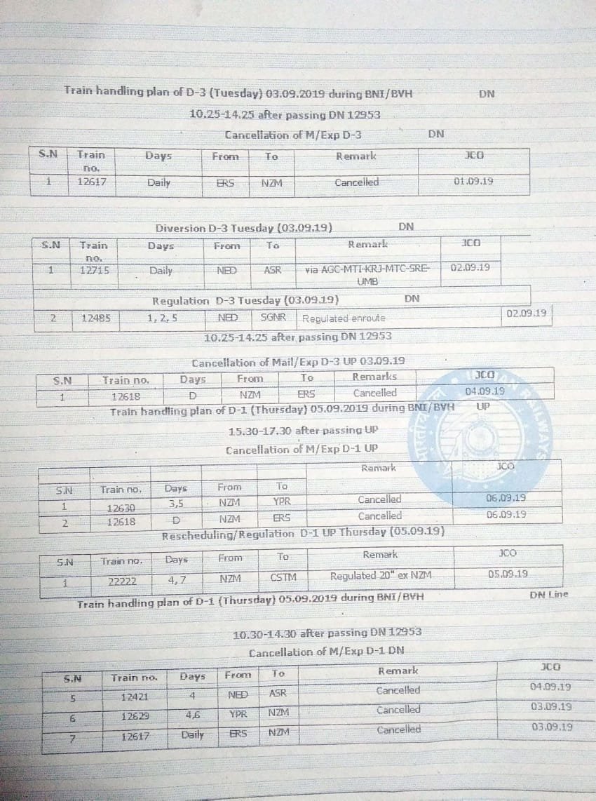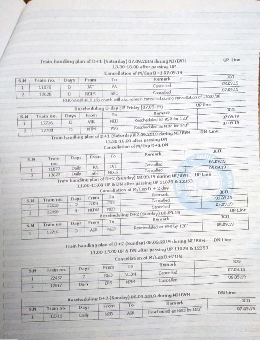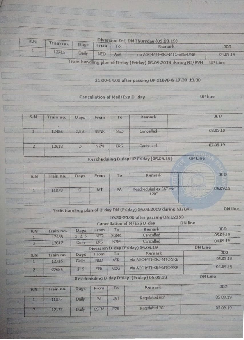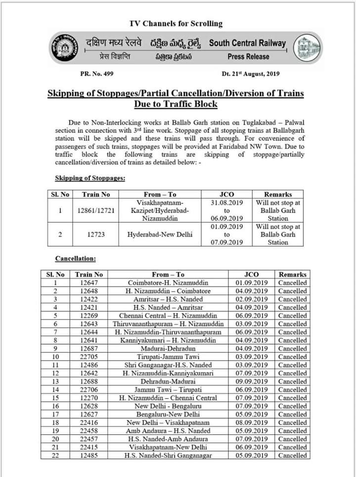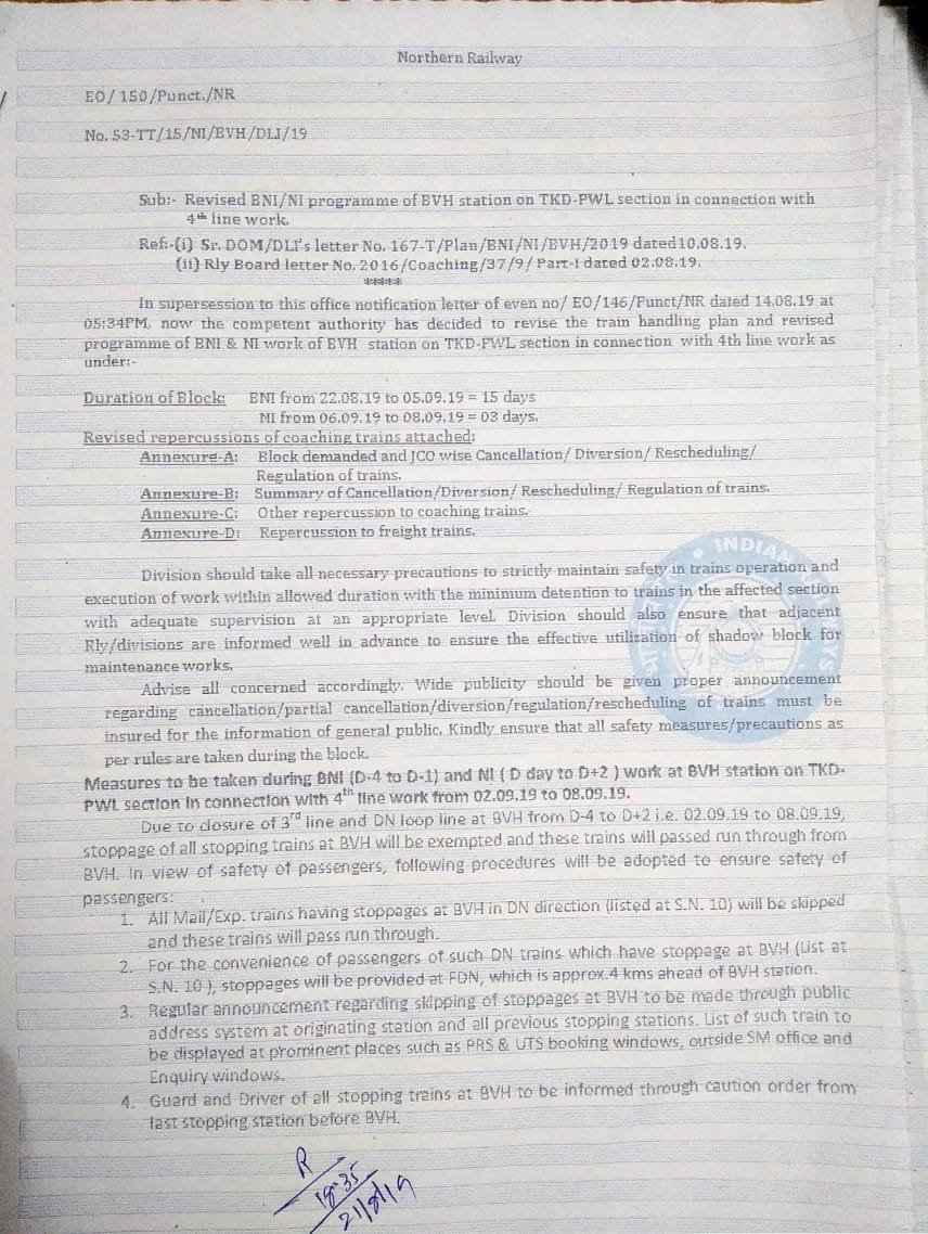 UncategorisedNorthern Railway : 22nd Aug 201922nd Aug 2019 Rail Duniya Circular regarding block at Ballabgarh on Tughlakabad – Palwal section – In the view, S C Railways circular- Share this: Share on WhatsApp (Opens in new window) WhatsApp Share on X (Opens in new window) X Share on Facebook (Opens in new window) Facebook Share on Telegram (Opens in new window) Telegram Email a link to a friend (Opens in new window) Email Like Loading... Related Published by Rail Duniya Rail Duniya is a magazine publishing all India train timings since 1988. View all posts by Rail Duniya