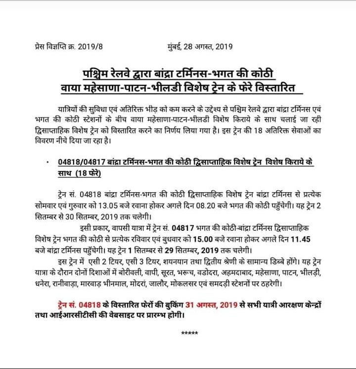 The 01709 Jabalpur-Atari weekly special train will depart from Jabalpur on every Saturday from 07.09.2019 to 28.12.2019 at 06.00 a.m. to reach Atari at 11.45 a.m. the next day (17 trips). In the return direction, the 01710 Atari-Jabalpur weekly special train will depart from Atari on every Sunday from 08.09.2019 to 29.12.2019 at 02.45 p.m. to reach Jabalpur at 07.50 p.m. the next day (17 trips ).