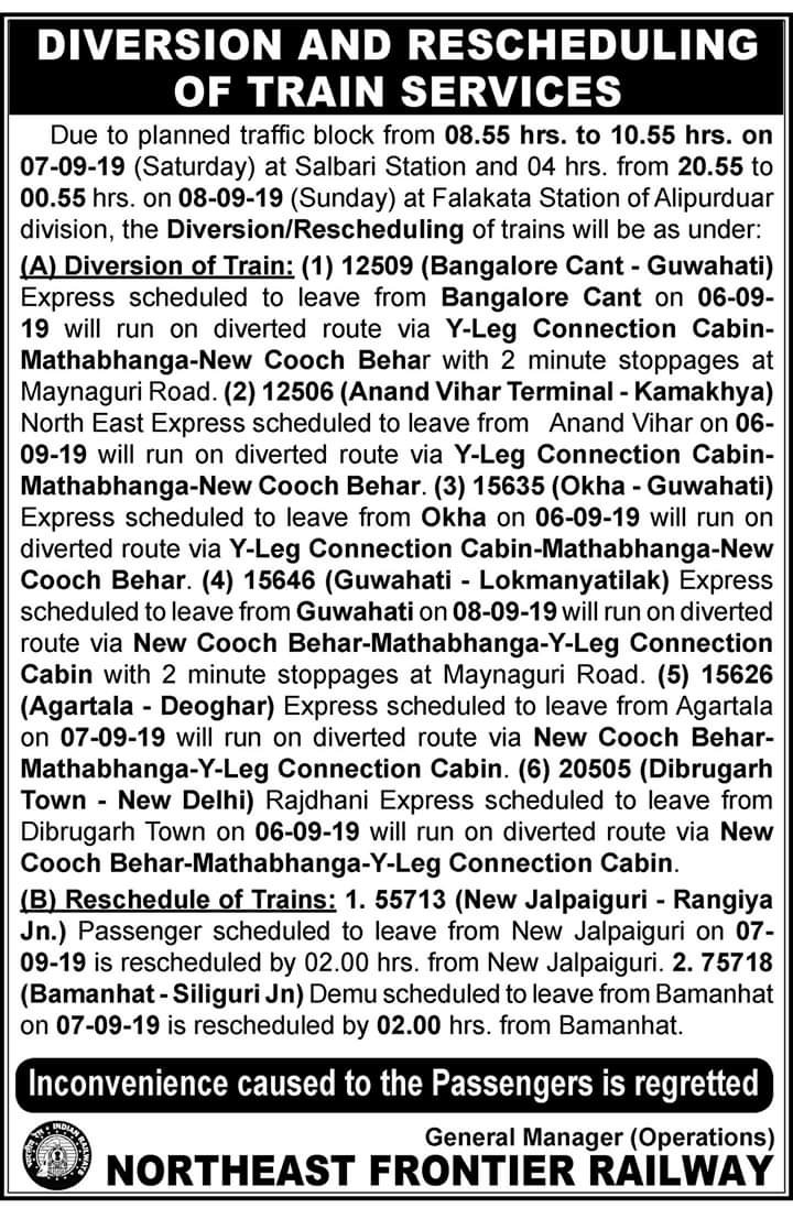 – 03 सितम्बर, 2019 को पटना से चलने वाली 16360 पटना-एर्नाकुलम एक्सप्रेस अपने निर्धारित मार्ग के स्थान पर परिवर्तित मार्ग पंडित दीनदयाल उपाध्याय जं.-इलाहाबाद छिवकी के रास्ते चलाई जायेगी।