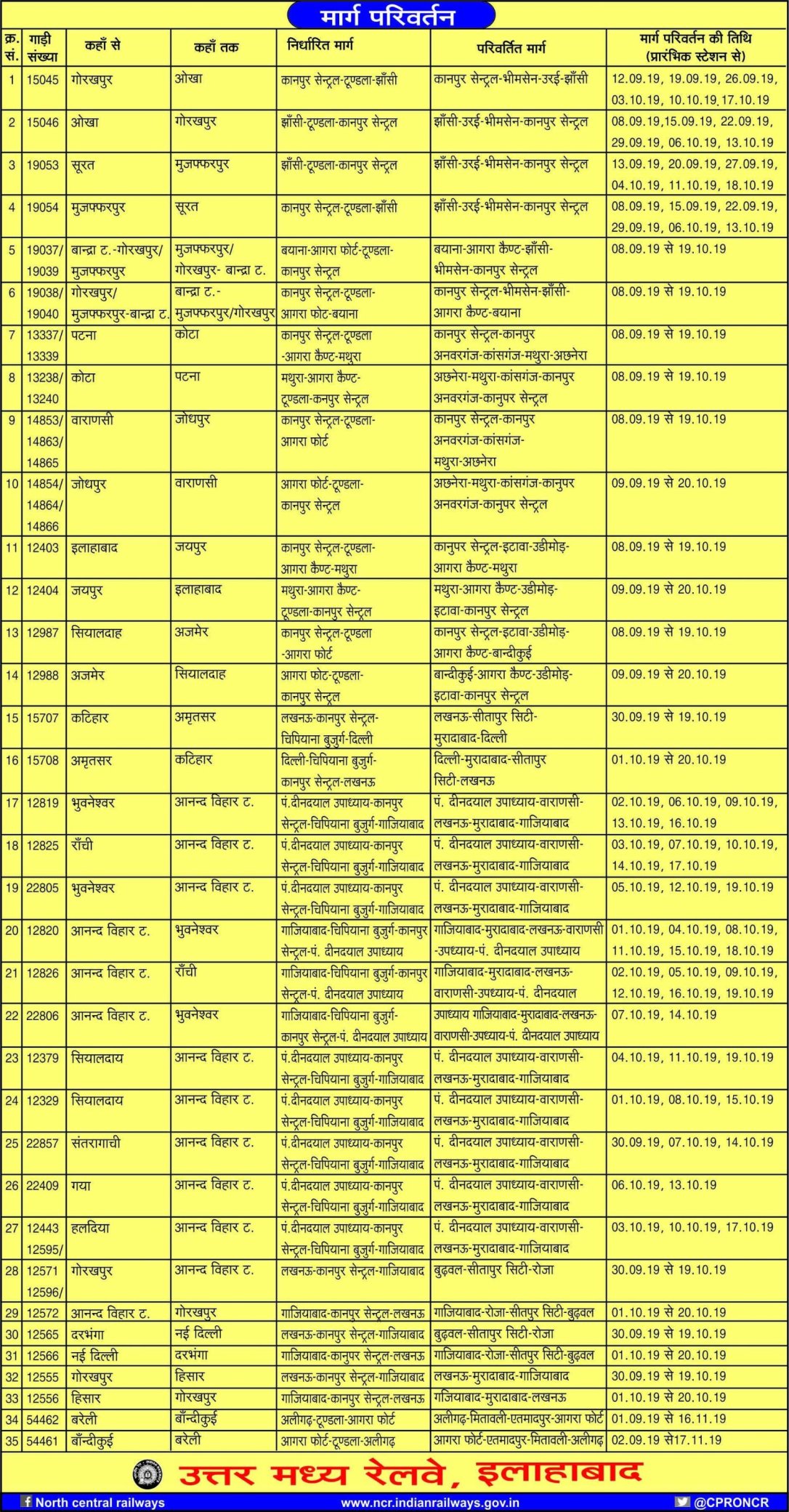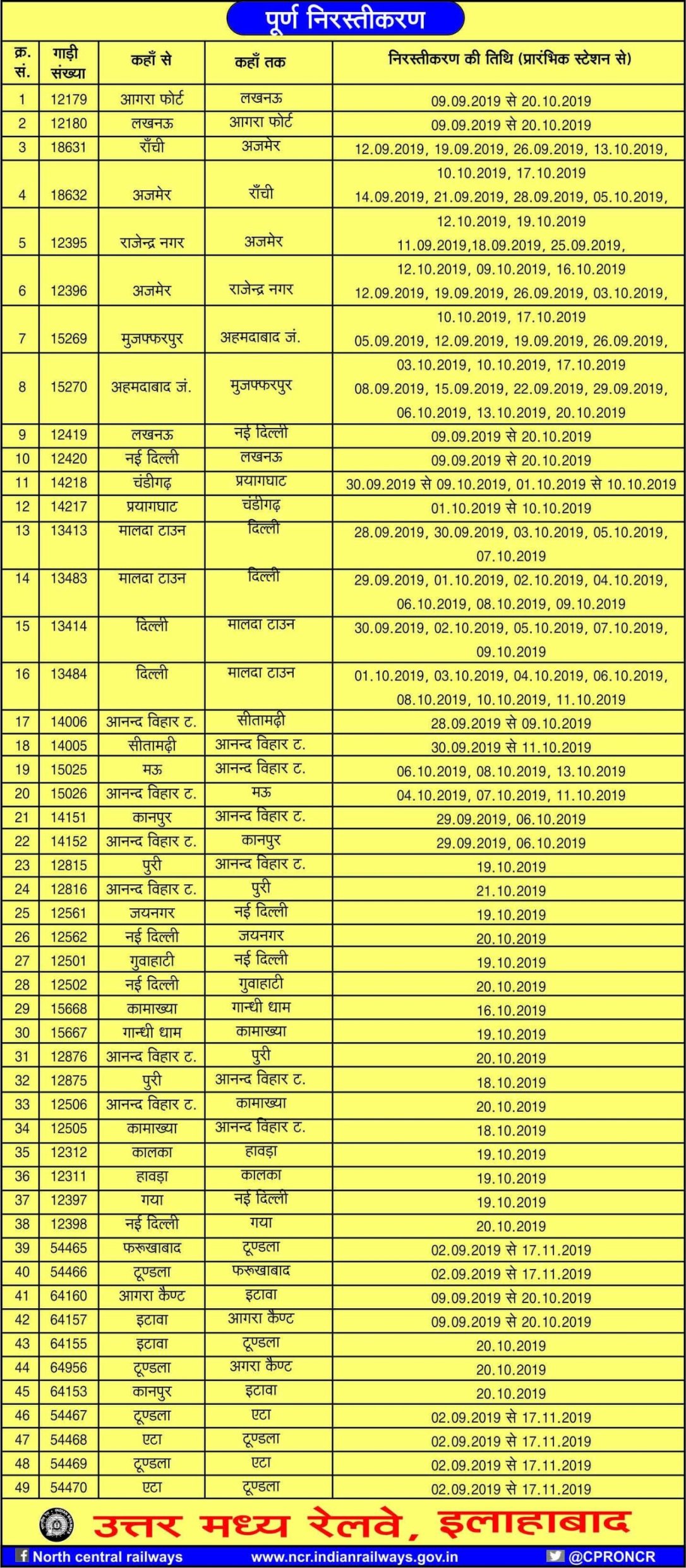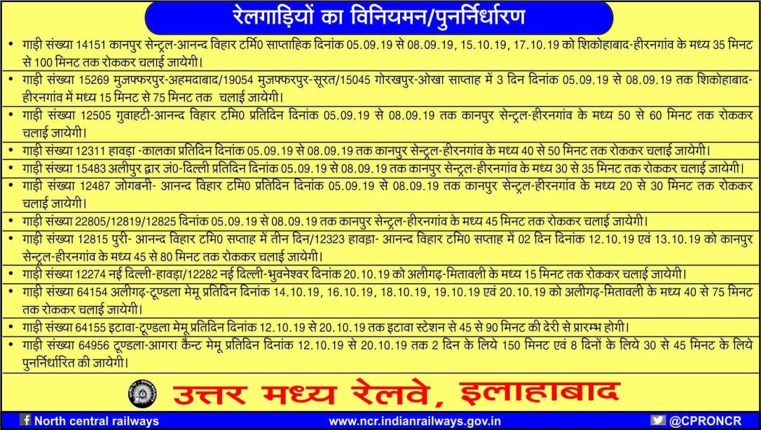 कुछ गाड़ियाँ रद्द, शार्ट टर्मिटनेट, डाइवर्ट की जाएगी।