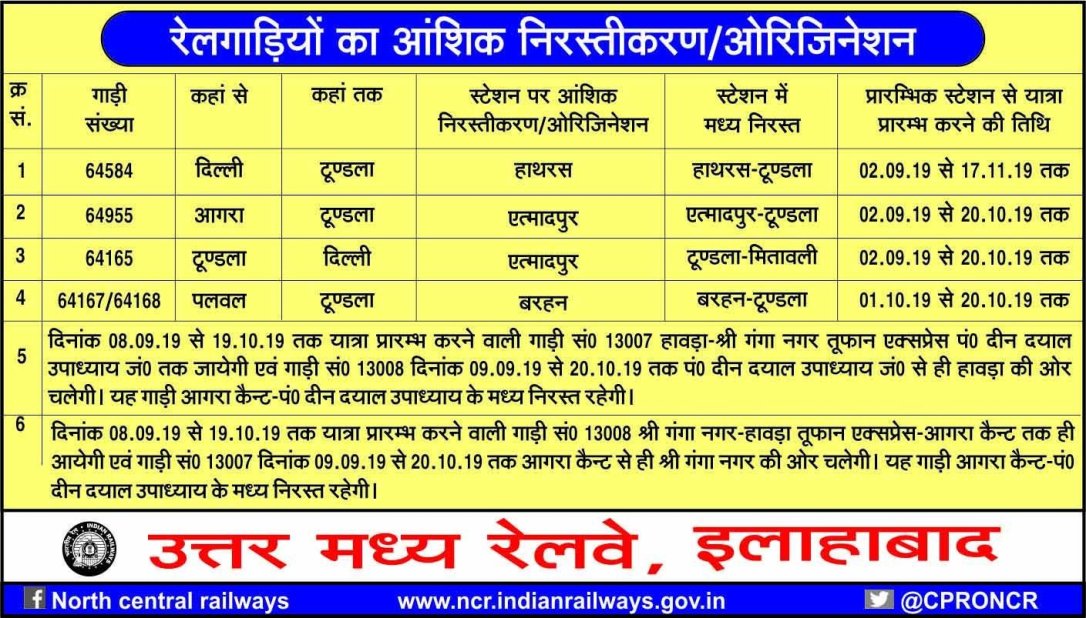 उत्तर मध्य रेलवे के टूंडला रेलवे स्टेशन के यार्ड का रिमॉडलिंग का कार्य 9 सितंबर से 20 अक्टूबर के बीच किया जाना है।