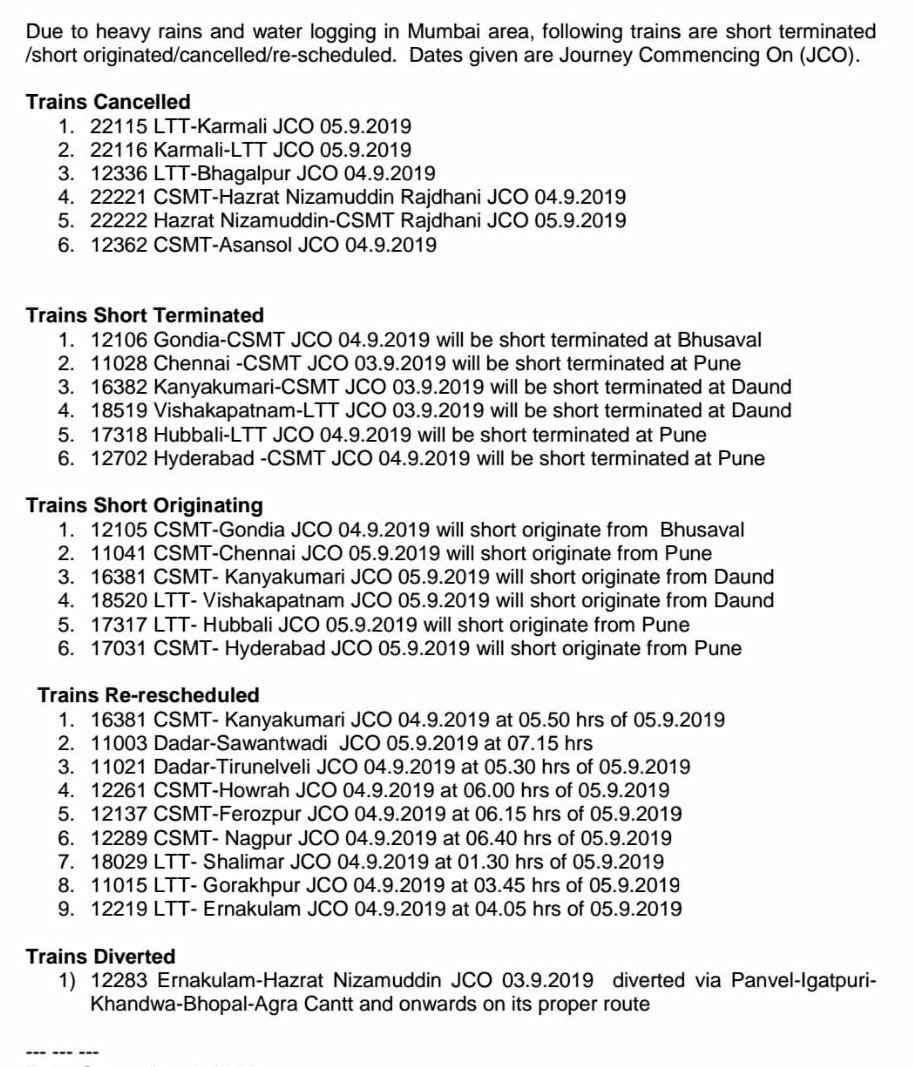UncategorisedMumbai updates : date 05/9/2019, time 0.10 5th Sep 2019 Rail Duniya Share this: Click to share on WhatsApp (Opens in new window) WhatsApp Click to share on X (Opens in new window) X Click to share on Facebook (Opens in new window) Facebook Click to share on Telegram (Opens in new window) Telegram Click to email a link to a friend (Opens in new window) Email Like Loading... Related Published by Rail Duniya Rail Duniya is a magazine publishing all India train timings since 1988. View all posts by Rail Duniya