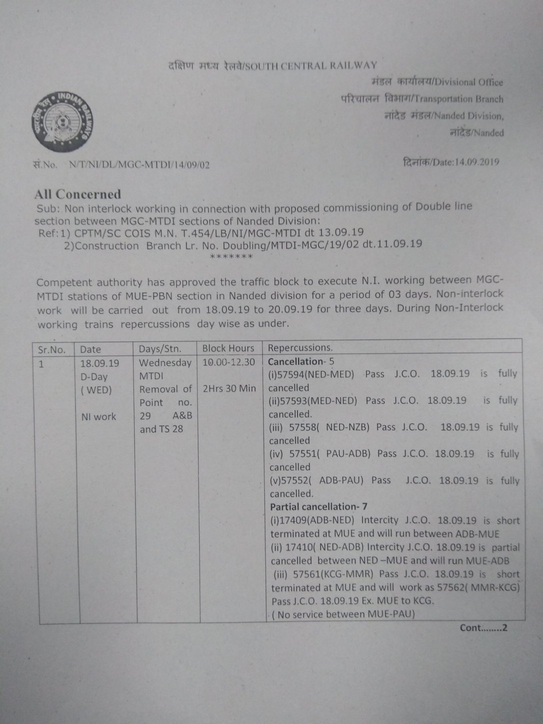 दक्षिण मध्य रेल्बे के नान्देड विभाग में मालटेकडी मुगुट स्टेशन के बीच रेल के दोहरीकरण का नॉन इंटरलॉकिंग कार्य दिनांक 18 सितंबर से शुरू होने जा रहा है।
