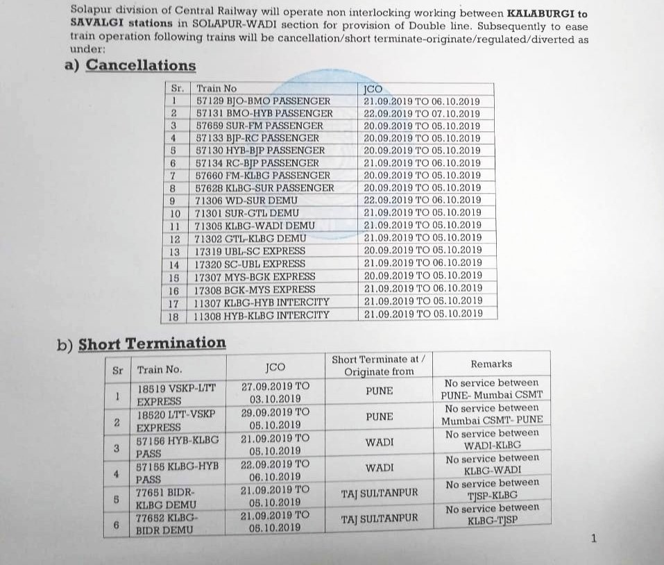 भाईयों, एक बात समझ लो, पूरे भारतीय रेल के नेटवर्कपर कहीं न कही, किसी न किसी सेक्शन में बुनियादी सुविधाओं के काम हो रहे है और इसीके चलते ब्लॉक भी लिए जा रहे है। कुछ पाना है तो कुछ तकलीफें भी सहना पड़ेगा। सोलापुर वाड़ी सेक्शन में रेल दोहरीकरण का कार्य किया जा रहा है, उसमे कलबुर्गी सावलगी स्टेशनोंके बीच 20 सितंबर से 6 अक्टूबर तक ब्लॉक लिया जा रहा है। जाहीर है कुछ गाड़ियाँ रद्द, कुछ गाड़ियाँ शार्ट टर्मिनेट रहेगी तो कुछ डाइवर्ट होकर चलाई जायेगी। देखते है कौनसी गाड़ियाँ और क्या स्थिति बनती है।