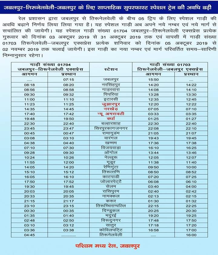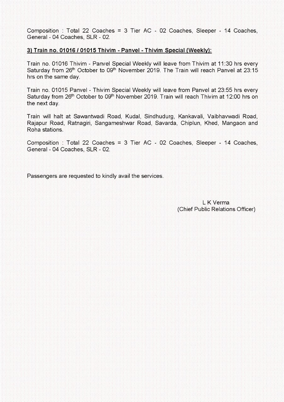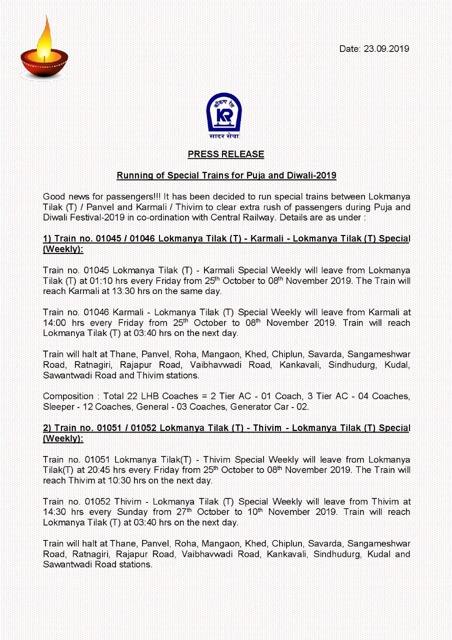 Winter holiday special trains has been announced. Lokmanya Tilak Terminus to Karmali, Thivim and Panvel to Tivim. Jabalpur to Tirunelvelli.