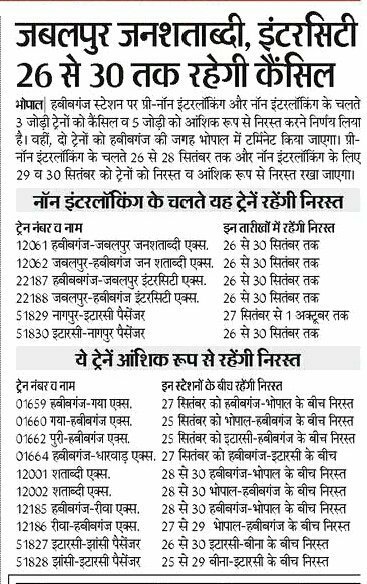 Uncategorisedहबीबगंज स्टेशनपर रेल ब्लॉक 25th Sep 2019 Rail Duniya पश्चिम मध्य रेलवे के हबीबगंज स्टेशनपर नॉन इंटरलॉकिंग का कार्य शुरू किया जा रहा है। गाड़ियाँ रद्द या शार्ट टर्मिनेट रहेगी। Share this: Share on WhatsApp (Opens in new window) WhatsApp Share on X (Opens in new window) X Share on Facebook (Opens in new window) Facebook Share on Telegram (Opens in new window) Telegram Email a link to a friend (Opens in new window) Email Like Loading... Related Published by Rail Duniya Rail Duniya is a magazine publishing all India train timings since 1988. View all posts by Rail Duniya