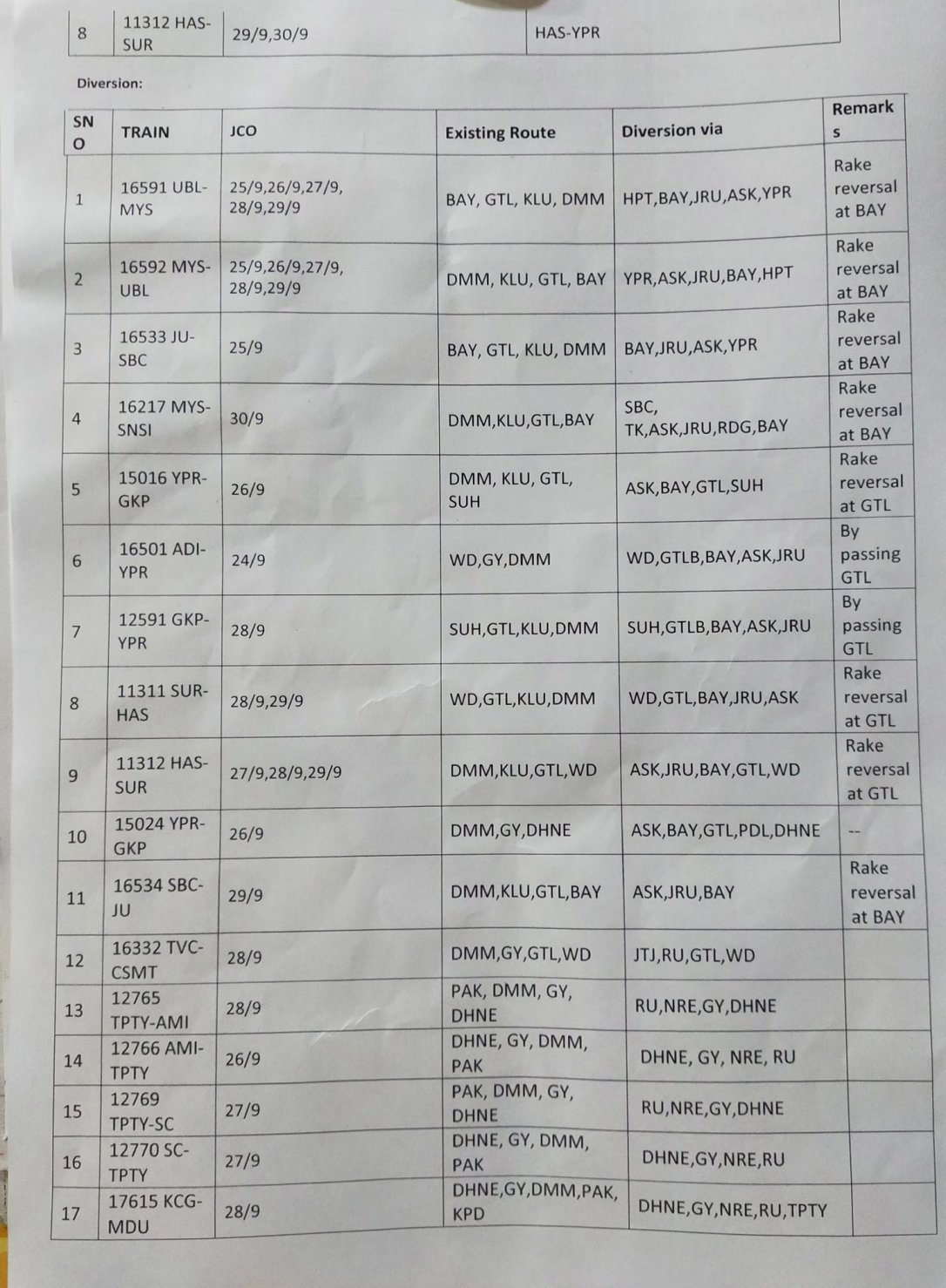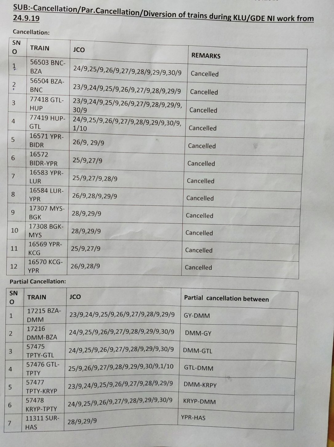 Rail block on SWRly, over Guntkal – Dharmavaram section, between Kalluru and Garladinne station for NI work.