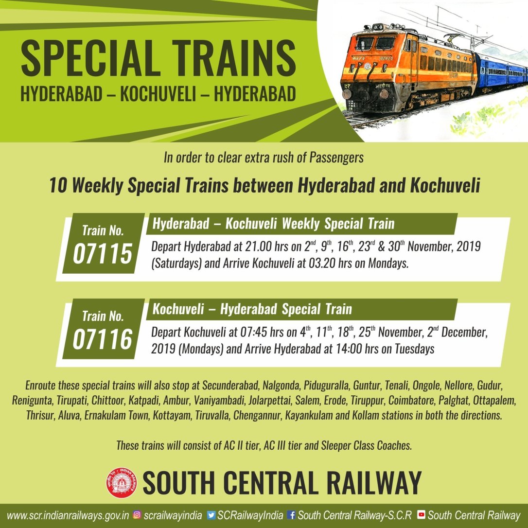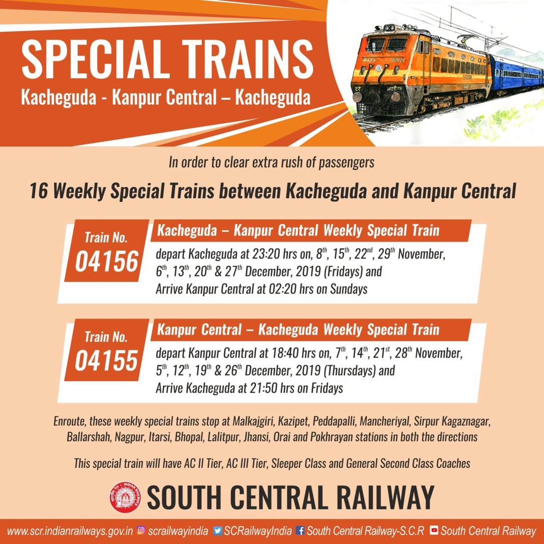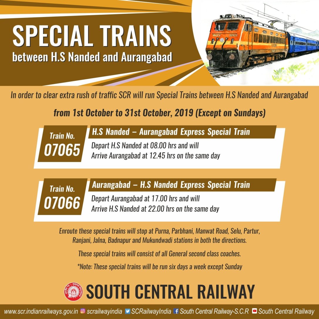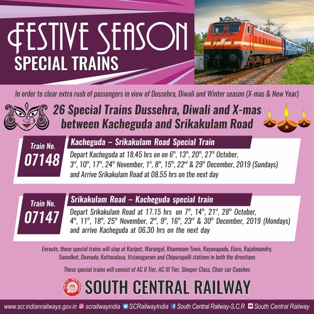 Uncategorisedदक्षिण मध्य रेलवे की ओरसे दीपावली स्पेशल गाड़ियाँ 27th Sep 201927th Sep 2019 Rail Duniya Share this: Share on WhatsApp (Opens in new window) WhatsApp Share on X (Opens in new window) X Share on Facebook (Opens in new window) Facebook Share on Telegram (Opens in new window) Telegram Email a link to a friend (Opens in new window) Email Like Loading... Related Published by Rail Duniya Rail Duniya is a magazine publishing all India train timings since 1988. View all posts by Rail Duniya