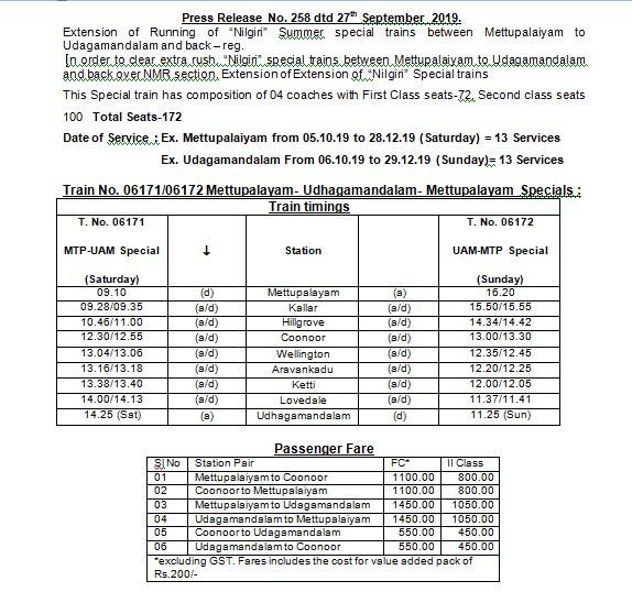 मेट्टूपालयम उदग्मण्डलम ट्रेन की छुट्टी स्पेशल गाड़ी।