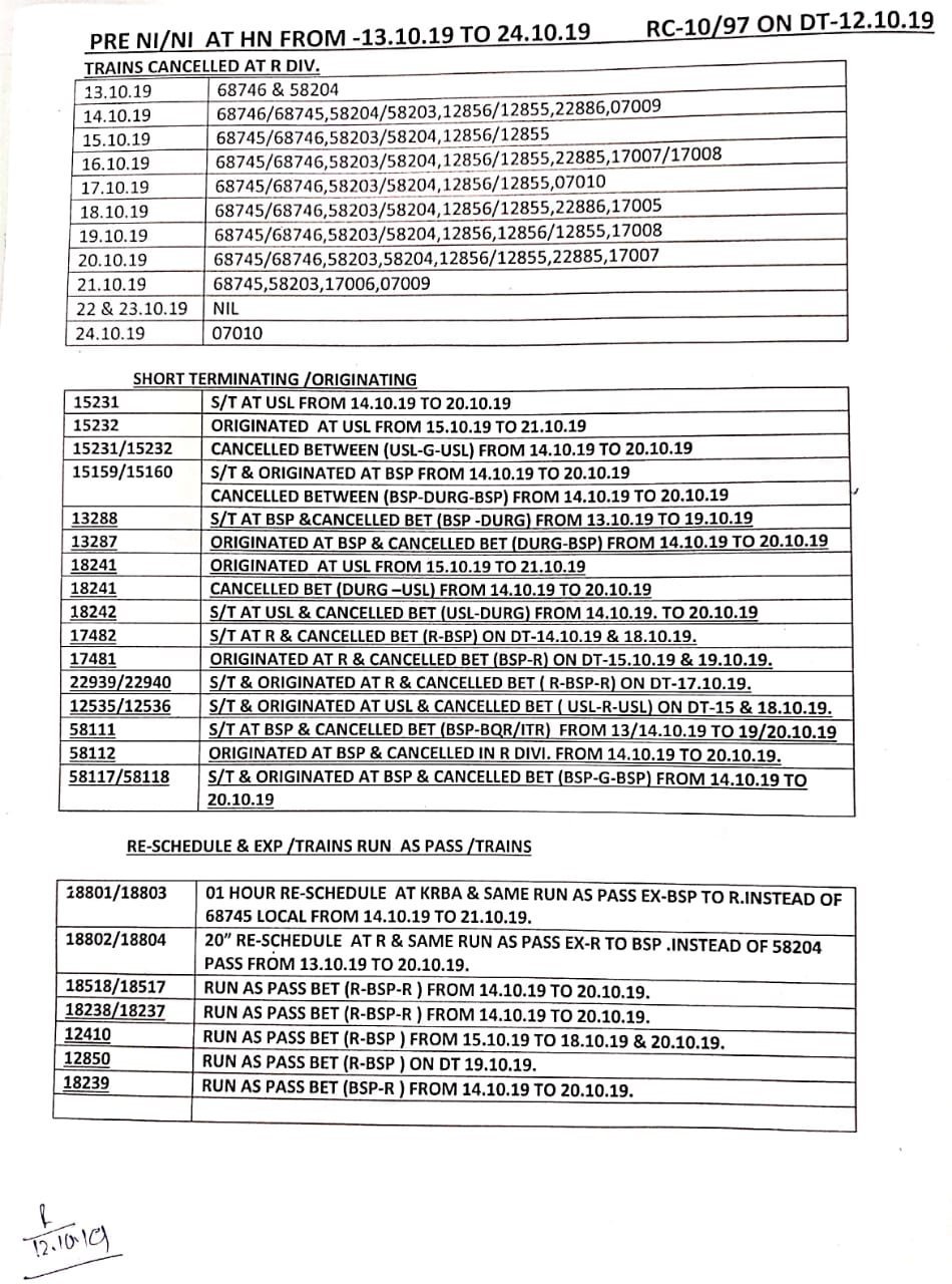 1) 18801/18803 हसदेव एक्सप्रेस दिनांक 14/10 से 21/10 तक और 18802 /18804 हसदेव एक्सप्रेस 13/10 से 20/10 तक रेग्युलेट की जाएगी।