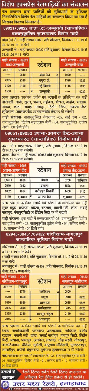 उत्तर मध्य रेलवे ने छूट्टीयोंमे यात्रिओंकी भीड़ को देखते हुए बांद्रा जम्मूतवी, उधना आगरा, गांधीधाम भागलपुर ऐसी स्पेशल गाड़ियाँ चलाने का परिपत्रक जारी किया है।