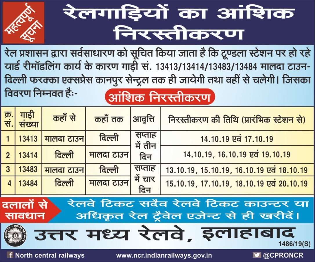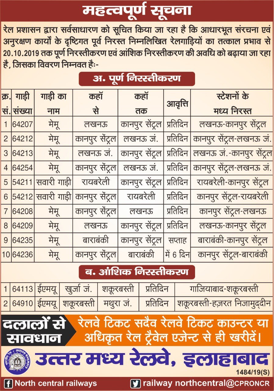 20 अक्तुबर तक कानपुर लखनऊ के बीच कुछ मेमू ओर पैसेंजर गाड़ियाँ रद्द रहनेवाली है। और 13413/13414 & 13483/13484 मालदा टाऊन एक्सप्रेस शॉर्ट टर्मिनेट की जा रही है।