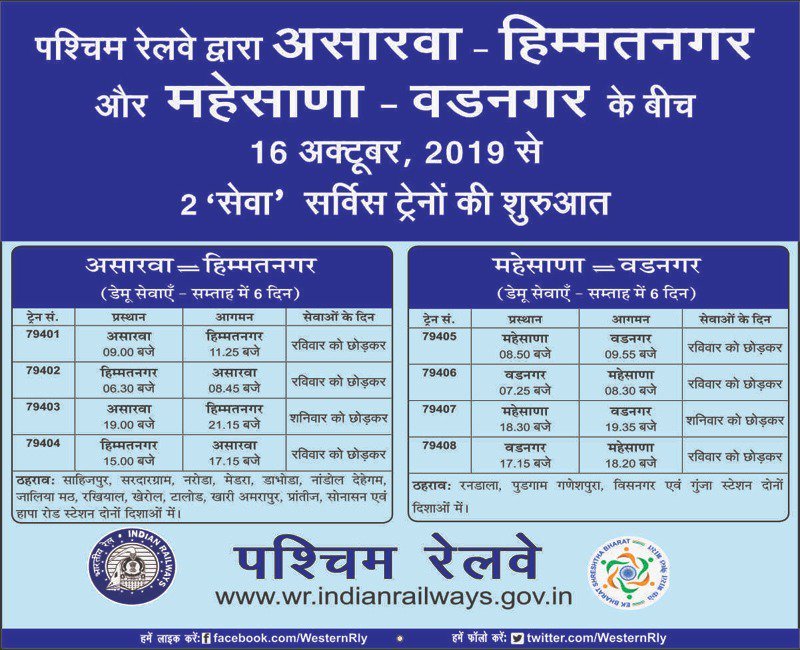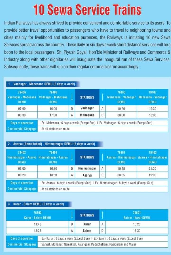 सेवा एक्सप्रेस नामसे 10 रेल गाड़ियाँ शुरू हो गयी है, ईनक उद्देश्य ब्रांच लाइनोंके छोटे स्टेशनोंको मुख्य लाइन के बड़े शहर से कनेक्टिविटी देना यह है। आइए ईनके समय और मार्गसे आपको अवगत कराते है।