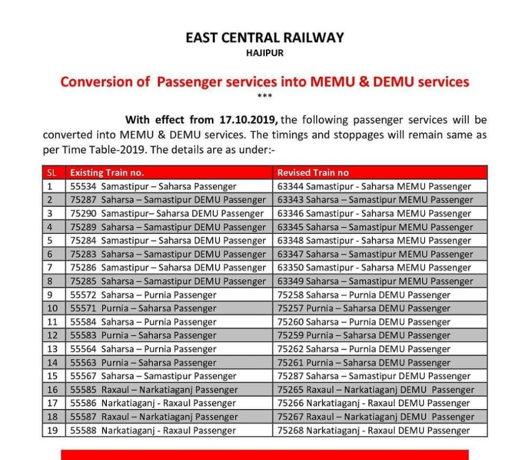पुर्व मध्य रेलवे की 19 पेसेंजर गाड़ियोंको रेल मार्ग का इलेक्ट्रिफिकेशन सम्पन्न होने की वजह से अत्याधुनिक मेमू गाड़ियोंमे बदला जा रहा है। इसकी लिस्ट यहांपर आपके लिए प्रस्तुत है। साथही हम रेलमंत्रीजी से निवेदन करते है, देश के सभी व्यस्त मार्गों पर फिलहाल जो पेसेंजर गाड़ियाँ चल रही है उन्हेंभी मेमू म बदला जाए।