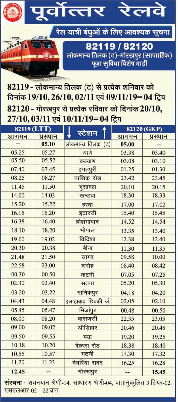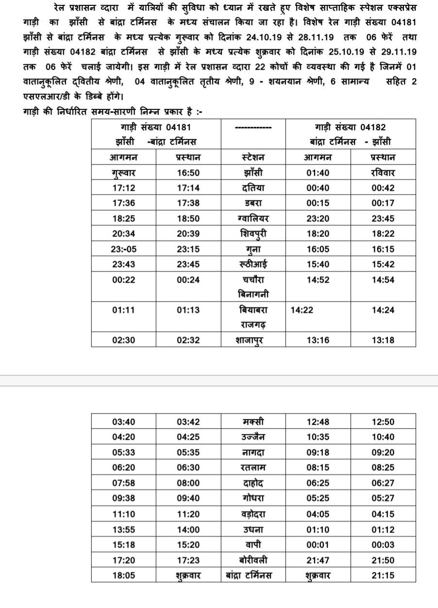 मध्य रेल की छठ पूजास्पेशल, और झांसी बांद्रा स्पेशल गाड़ियोंकी समय सारणी।