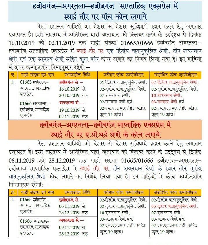 हबीबगंज अगरतला स्पेशल गाड़ी में बढ़ेंगी और जगह, बढ़ेंगे डिब्बे