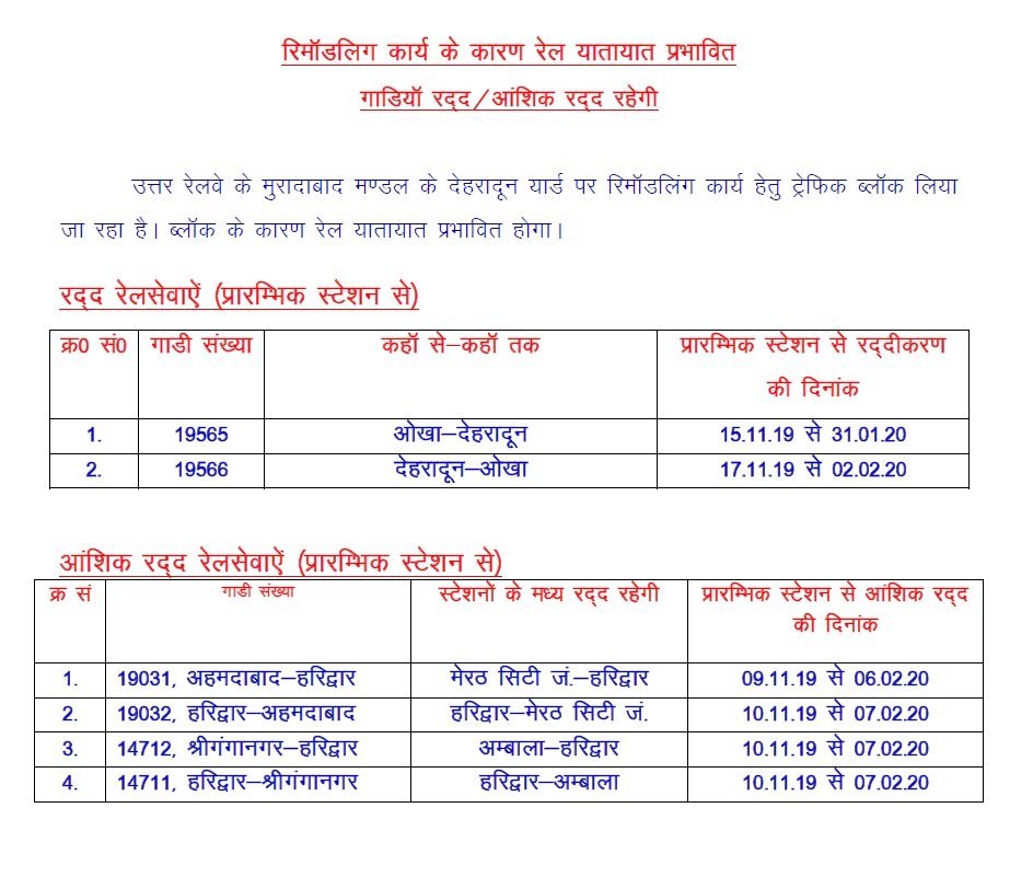 पश्चिम रेलवे की 19565/19566 ओखा देहरादून ओखा एक्सप्रेस दिनांक 15 नवम्बर से 02 फरवरी तक पुर्णतया रद्द रहेगी।
