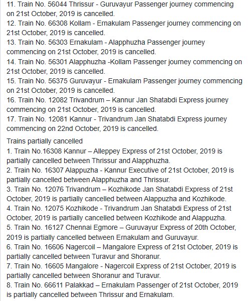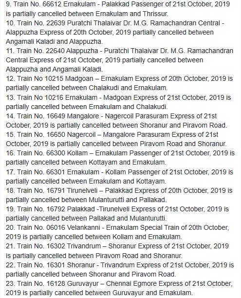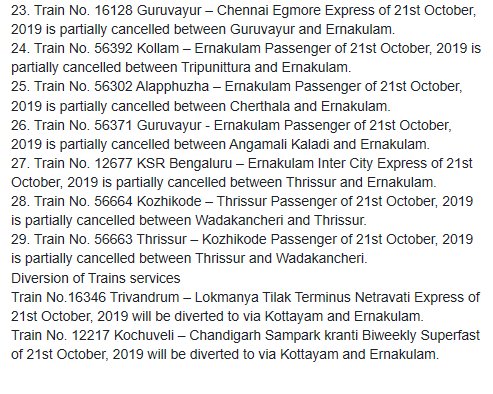 UncategorisedSouthern Railway : Trains cancelled due to heavy rain in Ernakulam area. 22nd Oct 2019 Rail Duniya Share this: Share on WhatsApp (Opens in new window) WhatsApp Share on X (Opens in new window) X Share on Facebook (Opens in new window) Facebook Share on Telegram (Opens in new window) Telegram Email a link to a friend (Opens in new window) Email Like Loading... Related Published by Rail Duniya Rail Duniya is a magazine publishing all India train timings since 1988. View all posts by Rail Duniya