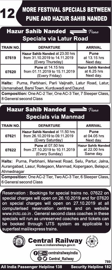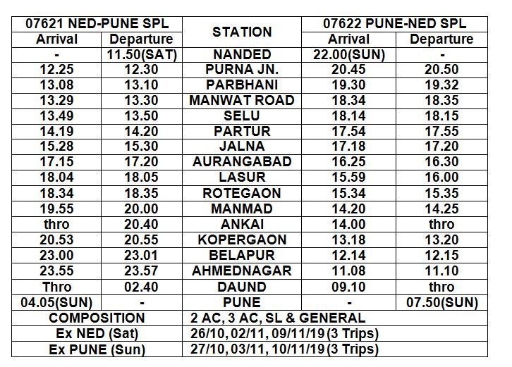 मध्य रेल : नान्देड पुणे नान्देड वाया कुरडूवाड़ी, लातूर और वाया मनमाड, औरंगाबाद