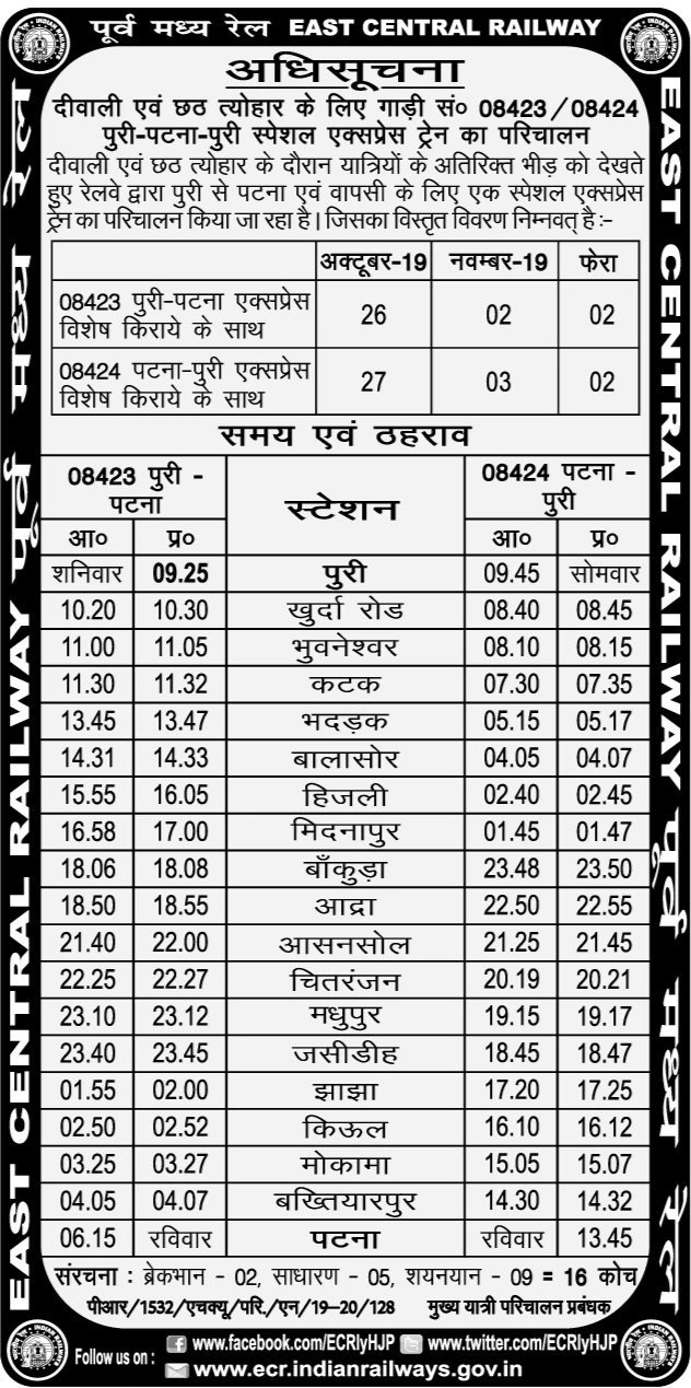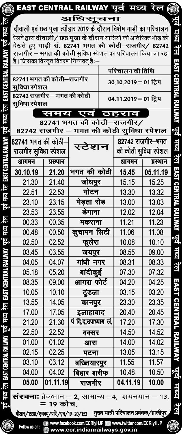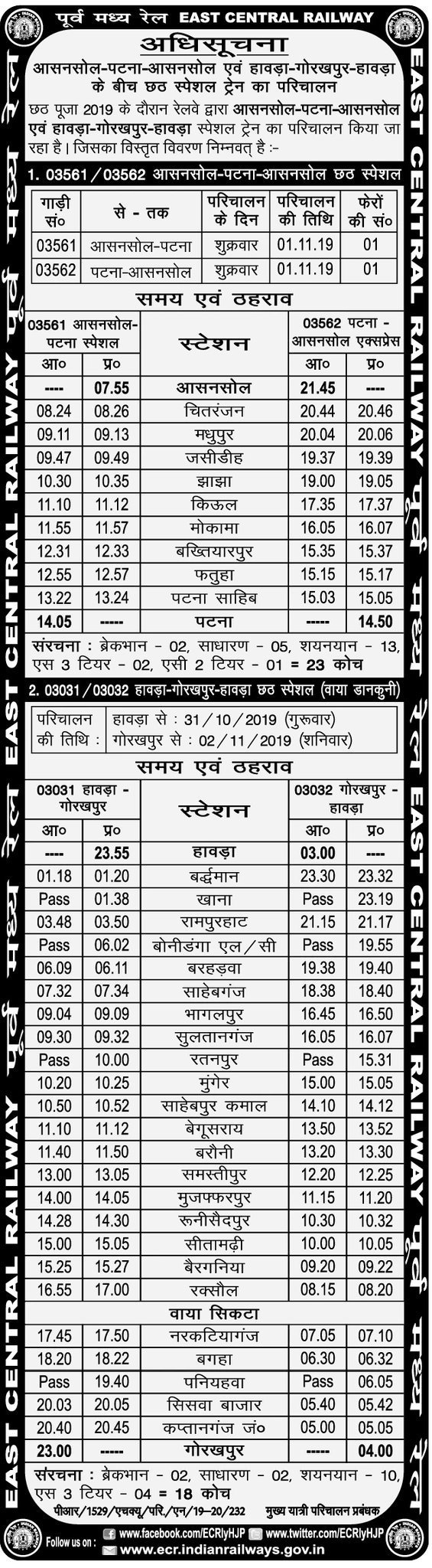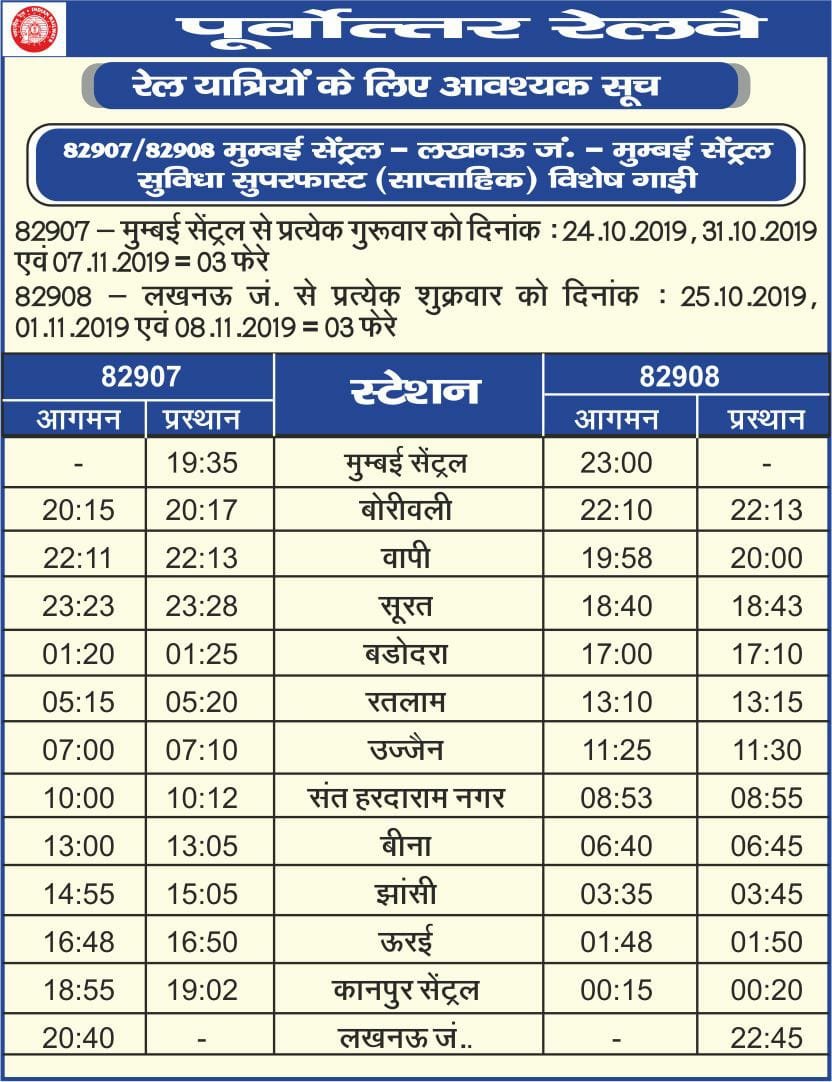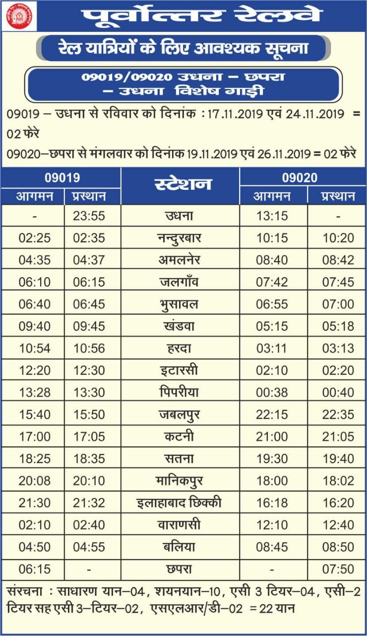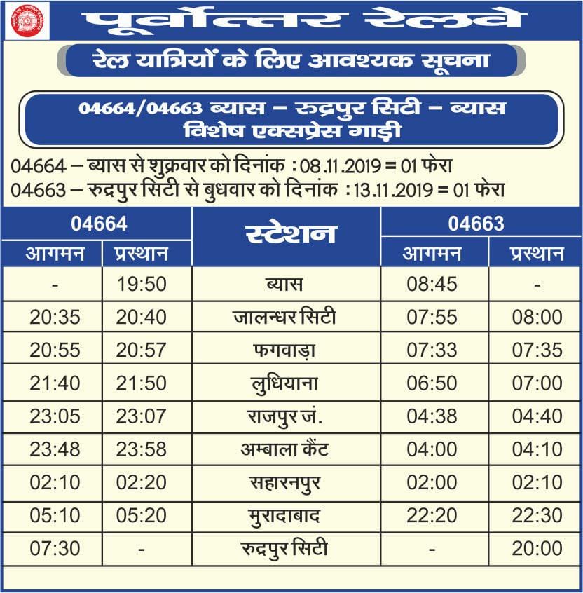 बांद्रा गोरखपुर बांद्रा, आसनसोल पटना आसनसोल, मुम्बई सेंट्रल लखनऊ मुंबई सेंट्रल, बियास रुद्रपुर बियास, हावड़ा गोरखपुर हावड़ा, उधना छपरा उधना, पूरी पटना पूरी, भगत की कोठी राजगीर भगत की कोठी
