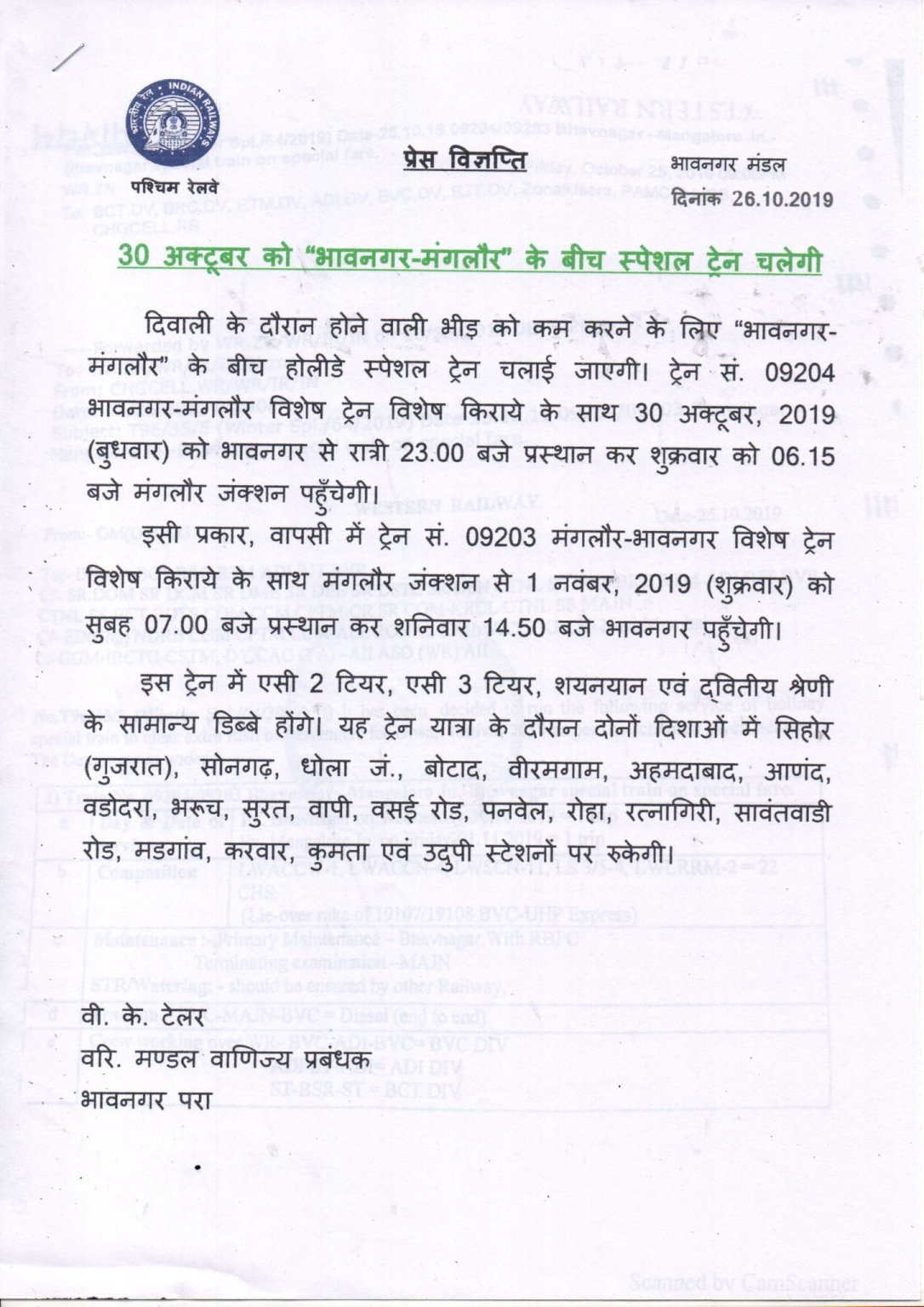 पश्चिम रेल : उधना छपरा उधना, भावनगर मंगलुरू भावनगर