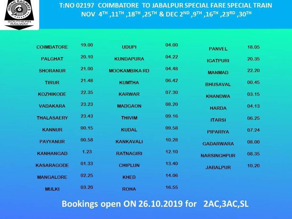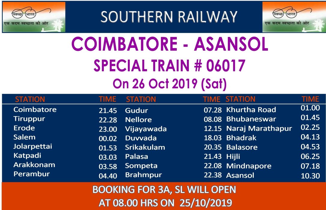 दक्षिण रेलवे : कोयंबटूर जबलपुर कोयंबटूर, कोयम्बटूर आसनसोल कोयम्बटूर स्पेशल्स