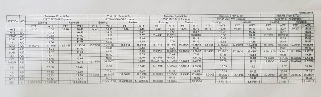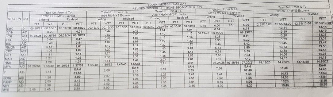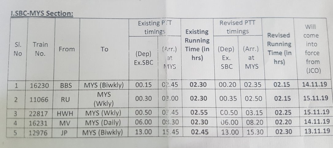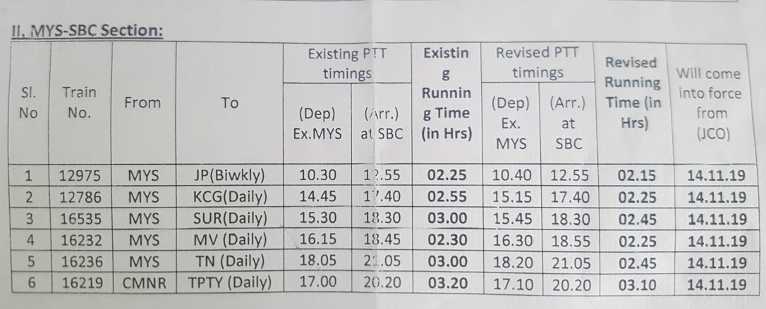 बंगालुरु मैसूरु के बीच गाड़ियोंको स्पीड अप किया जा रहा है, इसके चलते गाड़ियोंके समय बदले है। कृपया यात्रीगण ध्यान दें।