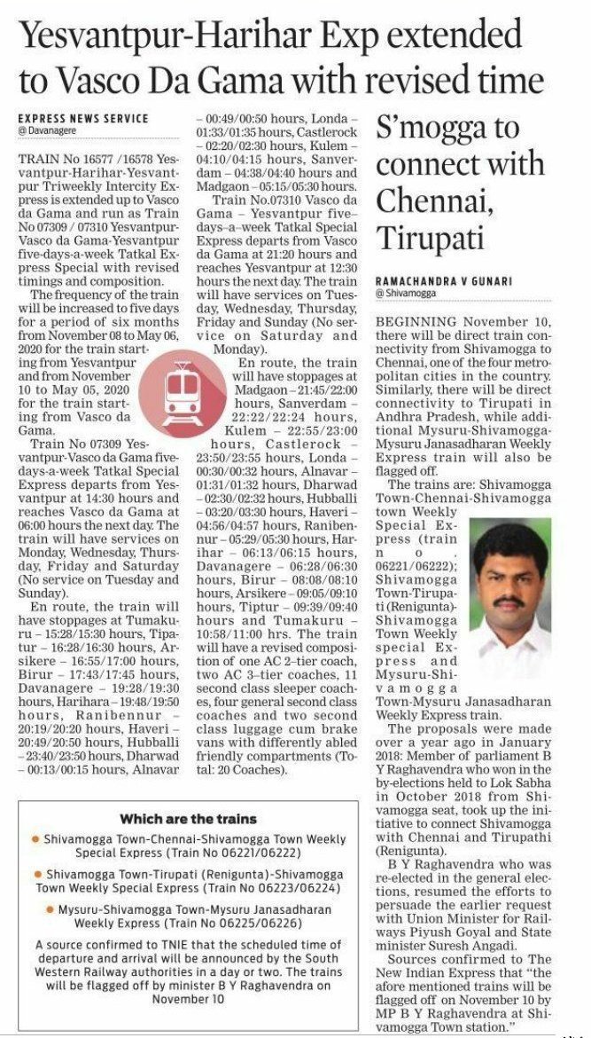 यसवंतपुर हरिहर एक्सप्रेस को वास्को तक सप्ताह में 5 दिन के लिए, तत्काल स्पेशल सेवा के स्वरूप में वास्को तक एक्सटेंड किया जा रहा है। इस संदर्भ में एक्सप्रेस न्यूज सेवा की खबर प्रस्तुत है।