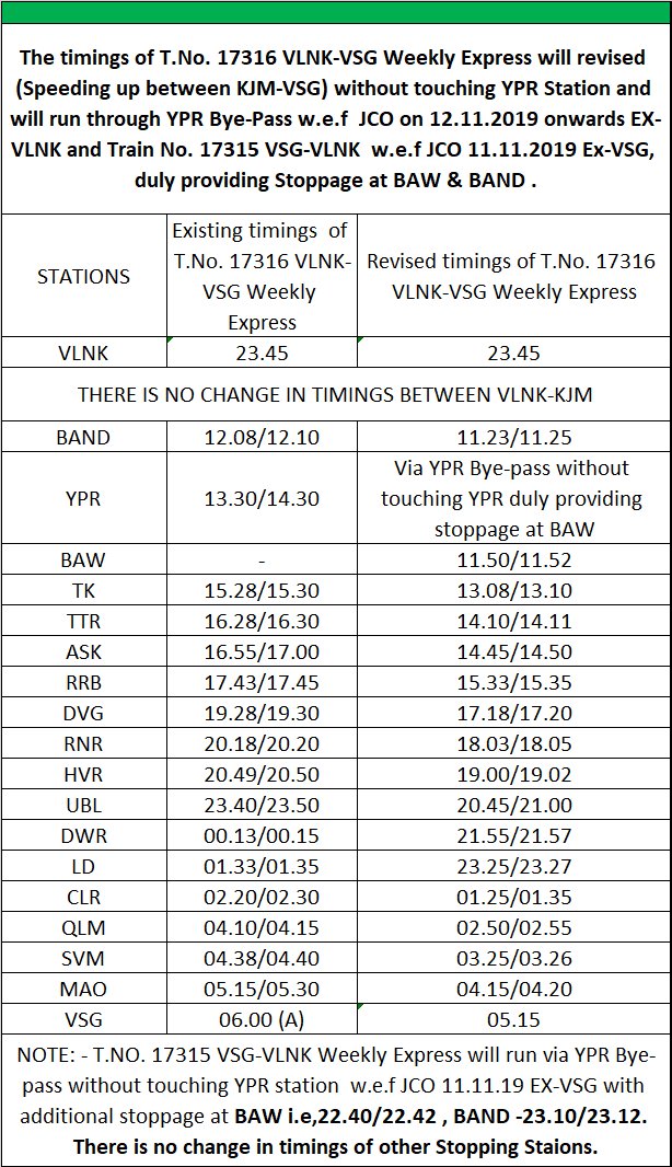 दक्षिण पश्चिम रेलवे : 17315 /17316 वास्को वेलांकिनी वास्को एक्सप्रेस को दिनांक 11 नवम्बर से यसवंतपुर बाईपास चलाया जाएगा, समय भी बदला।