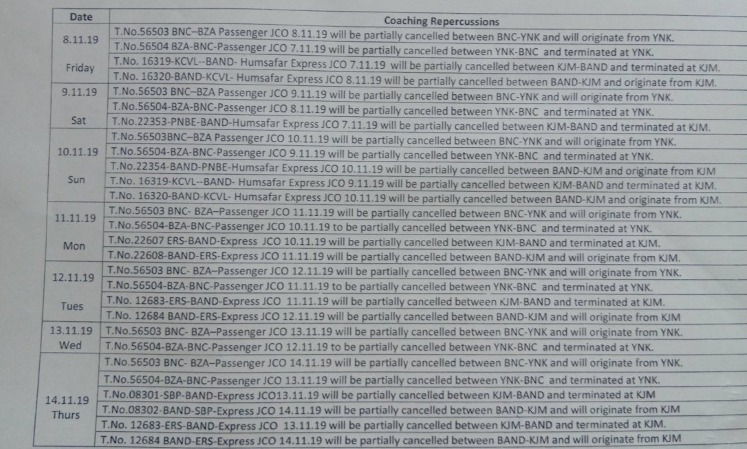 परिपत्रक में PTT याने पब्लिक टाईम टेबल और WTT याने वर्किंग टाईम टेबल यह अर्थ है। यात्रिओंके लिये PTT समयानुसार समयसारिणी रहेगी।