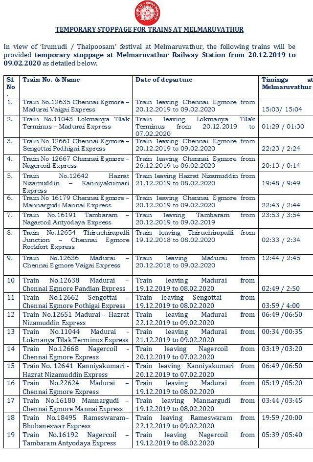 चेन्नई से 92 km की दूरी पर मेलमरुवथुर में अरुलमिगु आधिपराशक्ति सिद्ध पीठम का इरुमूड़ी थाईपुसम का बड़ा उत्सव होता है। इस उपलक्षमे, यात्रिओंकी सुविधाके लिए 20 दिसम्बर से 9 फरवरी तक निम्नलिखित गाड़ियाँ 2 मिनट के लिए रुकेगी।