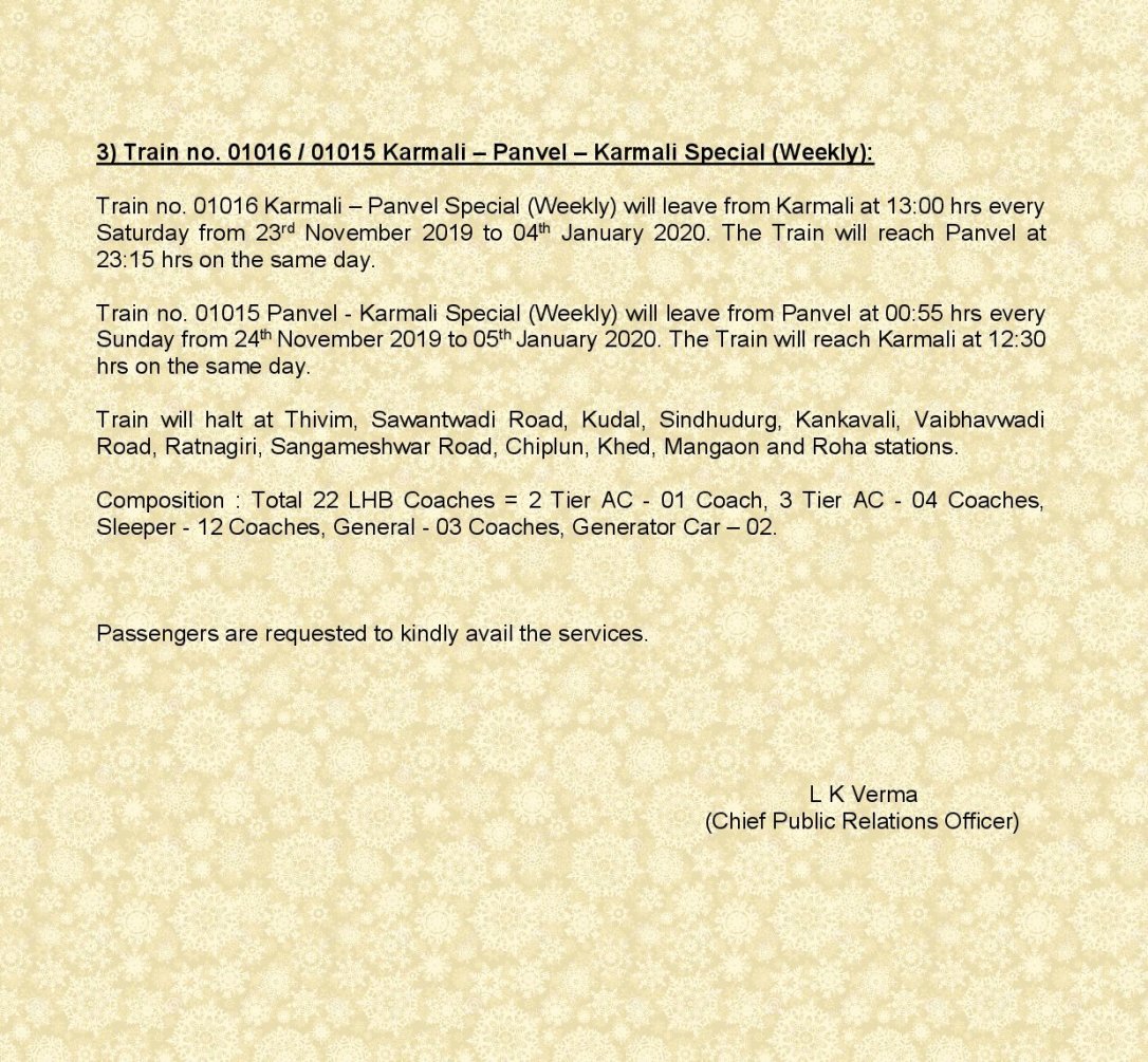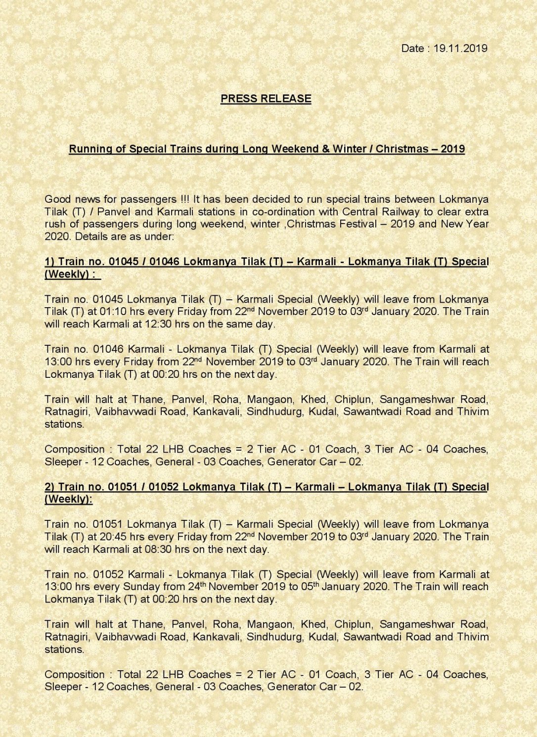 कोंकण रेलवे ने क्रिसमस स्पेशल गाड़ियोंकी लिस्ट जारी की है। यह गाड़ियाँ करमाळी और लोकमान्य तिलक टर्मिनस, पनवेल के बीच चलाई जाएगी।