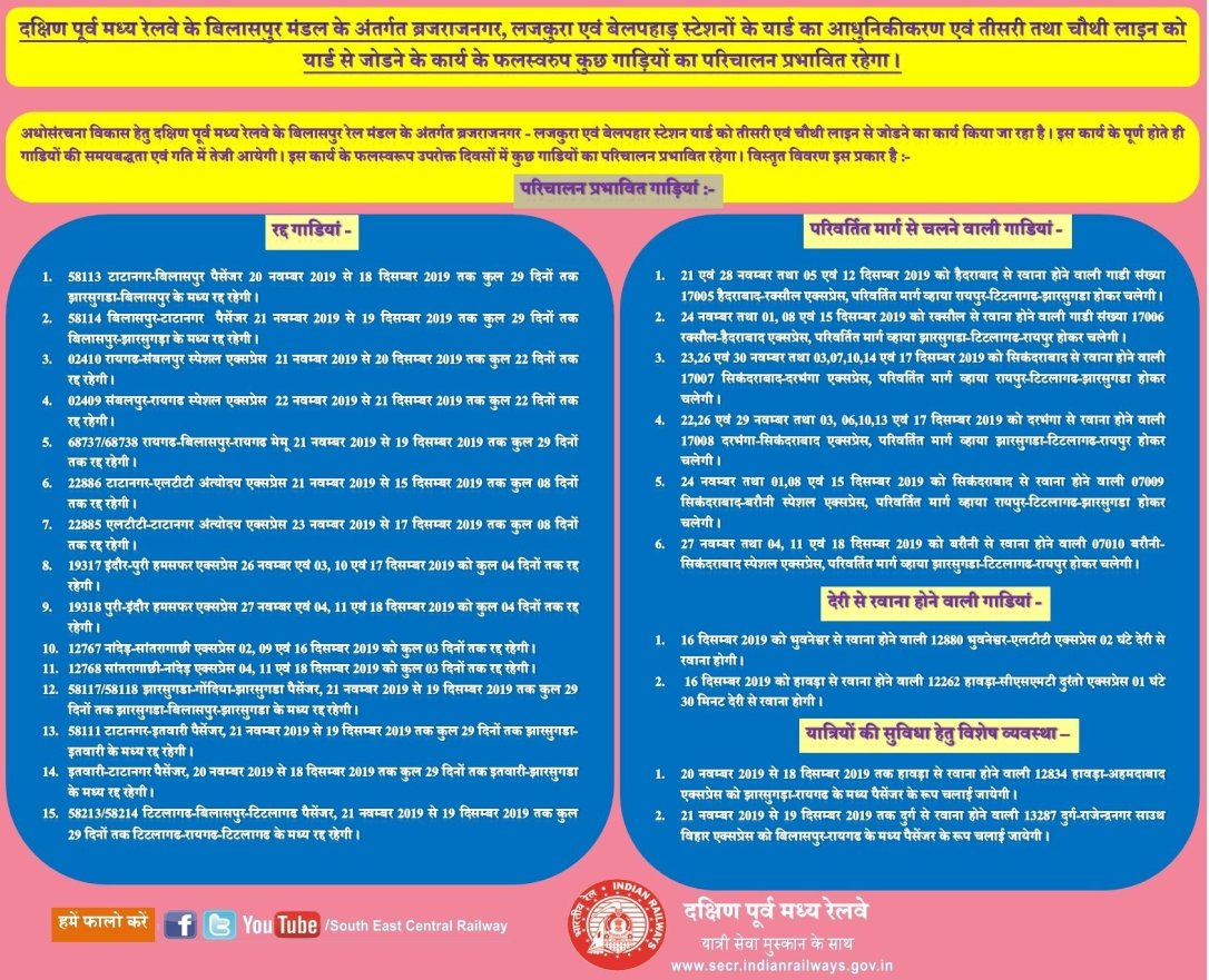 दक्षिण पूर्व मध्य रेल के बिलासपुर मण्डल में, झारसुगुड़ा और रायगढ़ के बीच, ब्रजराजनगर – लजकुरा – बेलपहाड़ स्टेशनोके यार्ड में तीसरी और चौथी लाइनका NI कार्य किया जाना है। इस कार्य के लिए 20 नवम्बर से 21 दिसम्बर तक कुछ गाड़ियाँ रद्द / मार्ग बदल कर चलाई जानी है।