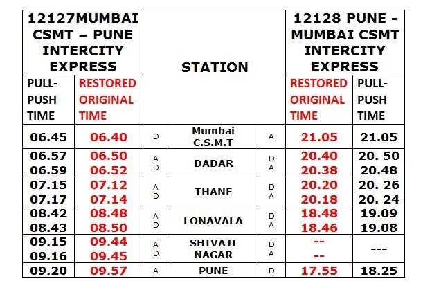 12127 / 12128 मुम्बई पुणे मुम्बई इंटरसिटी एक्सप्रेस प्रयोग के तौर पर पुश पुल मेथड से चलाई जा रही थी। इस प्रयोग में मुम्बई पुणे के बीच के सफर में 30 से 32 मिनट की बचत हो रही थी। गाड़ी मुम्बई से चलकर पुणे को जल्द पोहोंचती थी और वापसी में पुणे से 30 मिनट देरी से निकल कर रैगुलर समयपर मुम्बई पोहोंचाती थी। दिनांक 21 नवम्बरसे इन्टरसिटी एक्सप्रेस अपने पुराने समयसे चलाए जाने की सूचना आ गयी है। ( नियोजित समय लाल रंग में ) कृपया निम्नलिखित परिपत्रक देख ले और अपनी यात्रा के नियोजन करे।