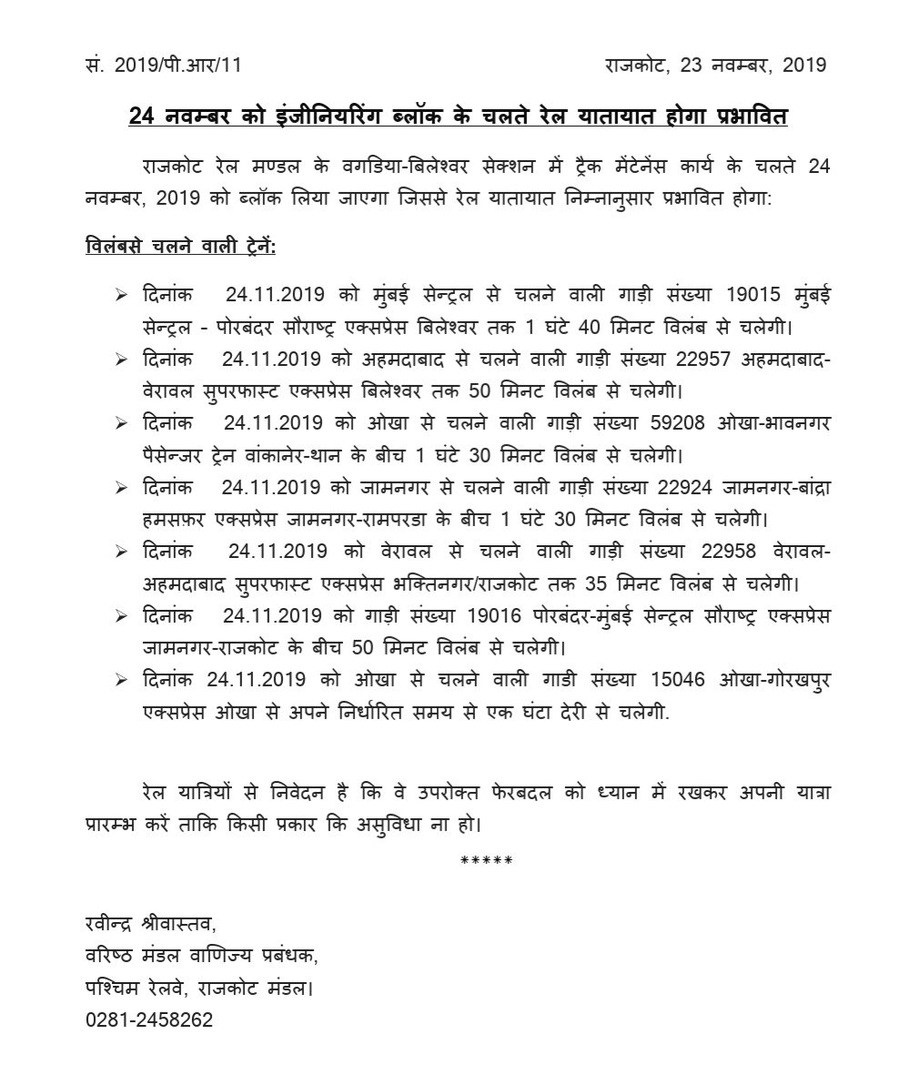 पश्चिम रेलवे के राजकोट मण्डलमे, बीलेश्वर से वगड़िया स्टेशनोके बीच 70 km में रेलवे का अनुरक्षण कार्य जारी है। इसके लिए रेल ब्लॉक लिया गया है। पश्चिम रेलवे ने एक परिपत्रक जारी कर गाड़ियोंके समय बदलाव की जानकारी दी है।