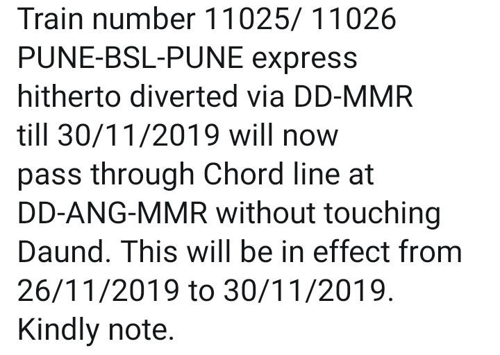 पुणे भुसावल पुणे हुतात्मा एक्सप्रेस भी डाईवर्ट होके पुणे से दौड़, अहमदनगर होते हुए मनमाड और भुसावल जा रही है। इस तकलीफ के बीच, थोड़े सुकून की खबर यह है, की यह गाड़ी अब दौंड बाईपास से दौंड स्टेशन पर अपना 1 घंटे का समय व्यर्थ न गवांते हुए सीधे मनमाड की ओर निकल जाएगी। उसी प्रकार आते हुए भी यह गाड़ी दौंड स्टेशन को बाईपास करेगी।