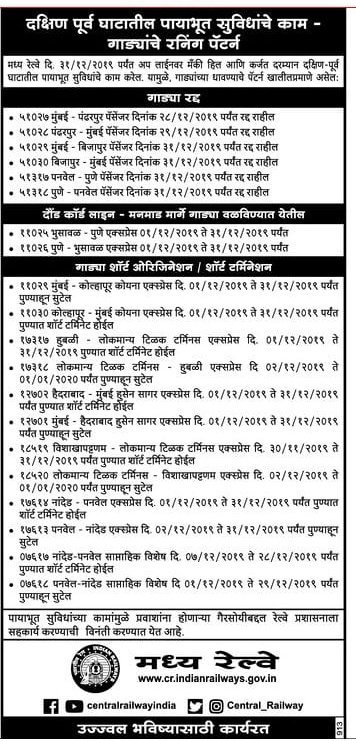· 17317 Hubballi-LTT Express JCO 1.12.2019 to 31.12.2019 will short terminate at Pune